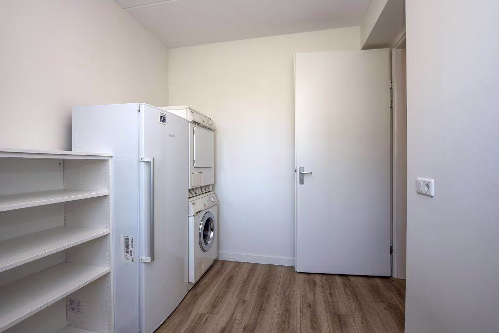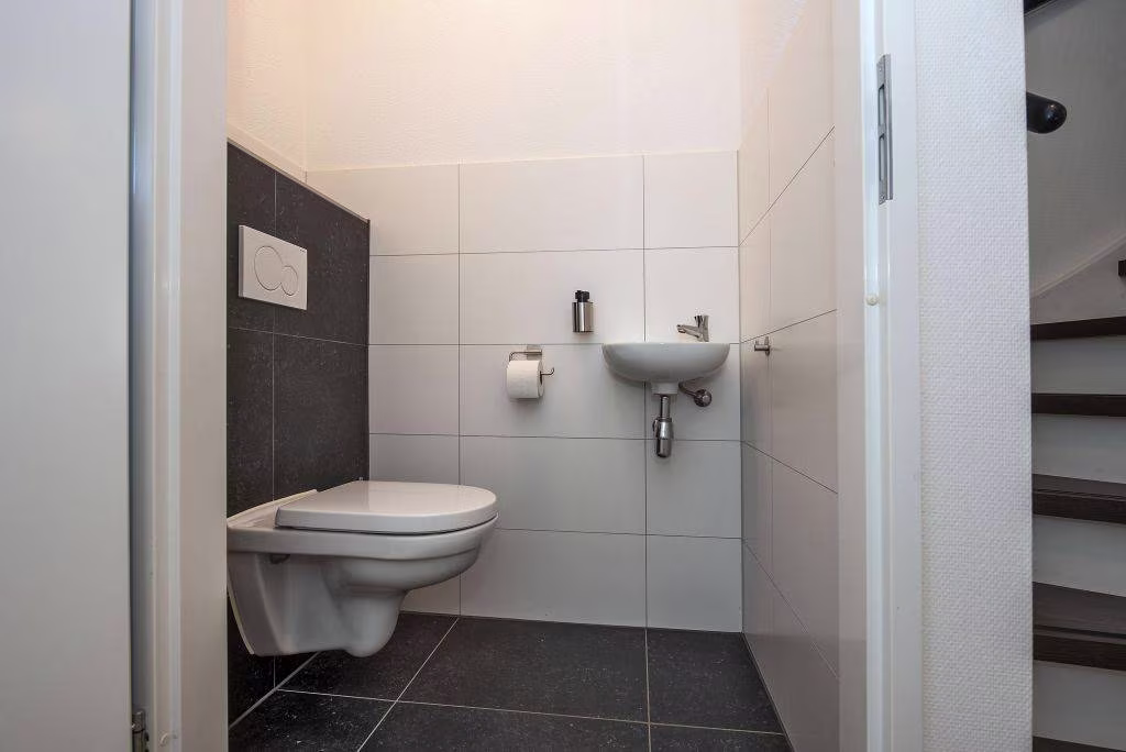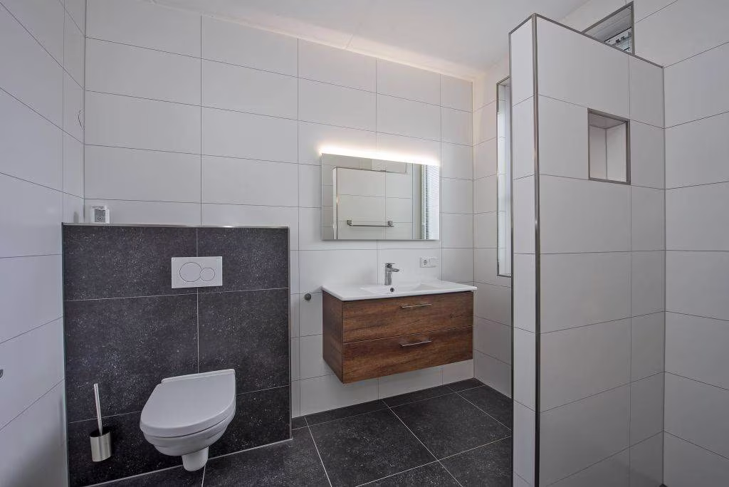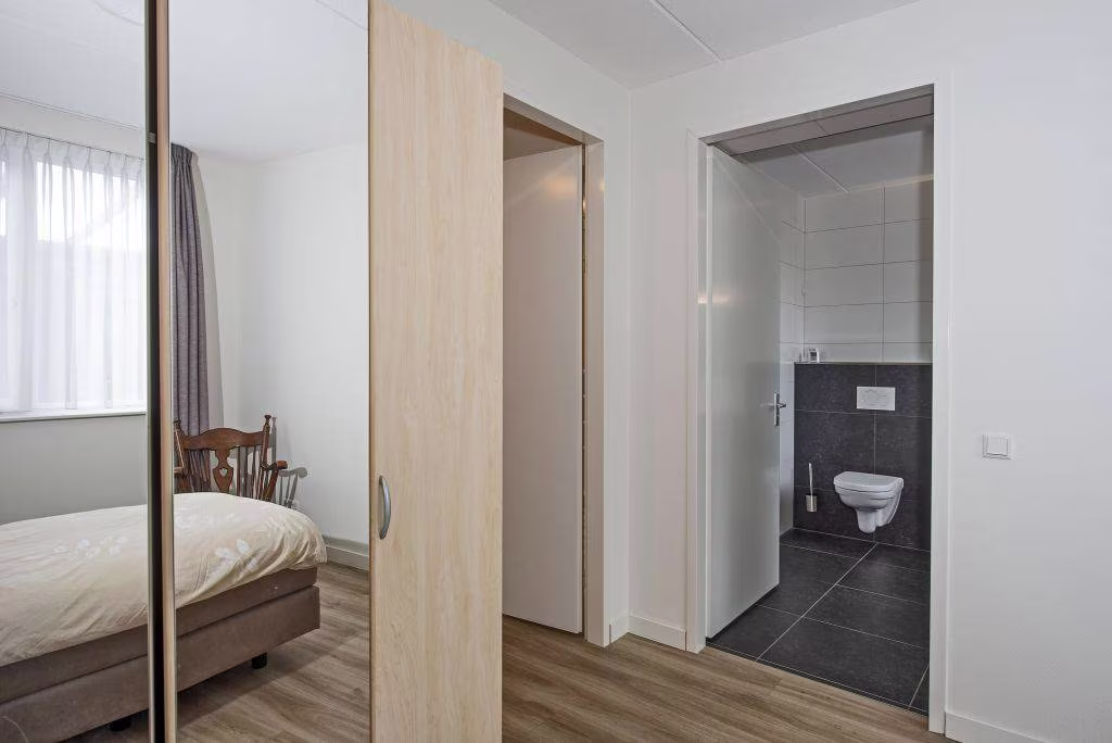 Via de hal bereik je de slaapkamer op de begane grond, met direct aansluitend de badkamer. De badkamer is voorzien van een inloopdouche, wastafel met meubel en toilet. Alles gelijkvloers en binnen handbereik, wat zorgt voor comfortabel en toekomstgericht wonen. Vanuit de hal is daarnaast een tweede bijkeuken bereikbaar, voorzien van een witgoedaansluiting en een deur naar de oprit.