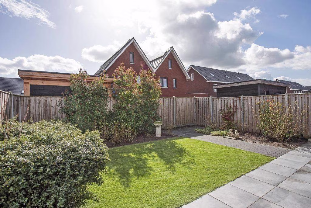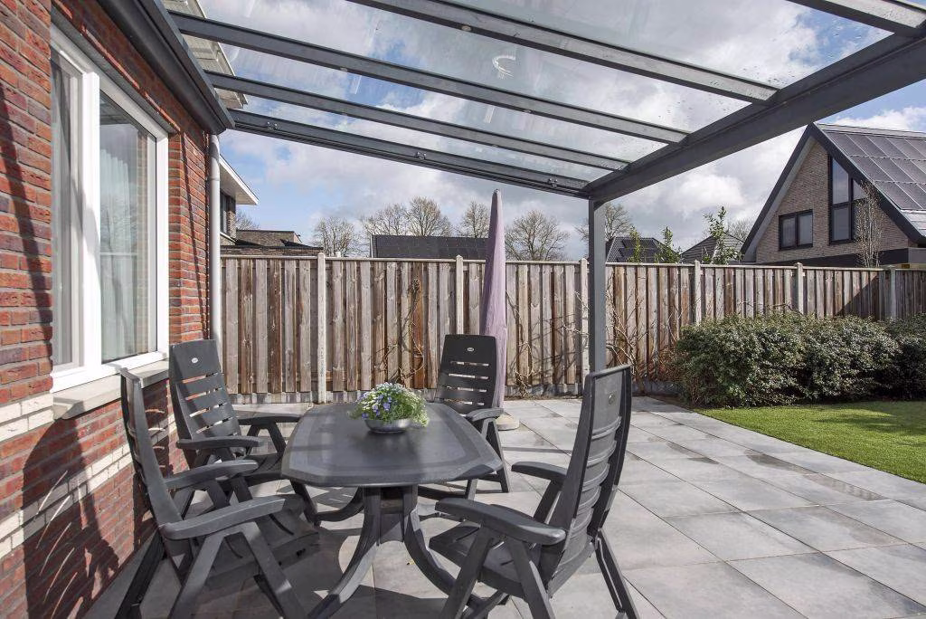 Aan de achterzijde stap je vanuit de keuken zo onder de veranda. Een heerlijke plek waar je al vroeg in het voorjaar geniet van je eerste kop koffie en waar je ’s avonds nog lang buiten zit. Beschut, sfeervol en echt een verlengstuk van je woning. De tuin is netjes aangelegd en praktisch ingericht. Met veel groen, waardoor het geheel een mooie uitstraling heeft.