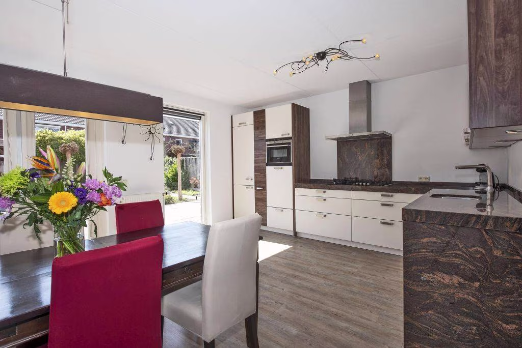 Begane grond: entree, hal voorzien van meterkast, toilet met fonteintje, ruimte voor een garderobe, trapopgang naar de eerste verdieping, straatgerichte woonkamer met sfeervolle gashaard en vrij uitzicht aan de voorzijde. Aan de achterzijde bevindt zich de directe toegang tot de achtertuin. Grote open woonkeuken voorzien van een 4-pits gaskookplaat met wokbrander, afzuigkap, vaatwasser, koel-vriescombinatie, combi-oven/magnetron, praktische apothekerskast en carrousel.
