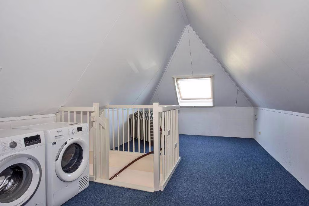 Tweede verdieping: via een vaste trap bereikbare zolderruimte met stook- en wasopstelling, dakraam en voldoende ruimte voor opslag. Hier bestaat de mogelijkheid om extra (slaap)kamers te realiseren.