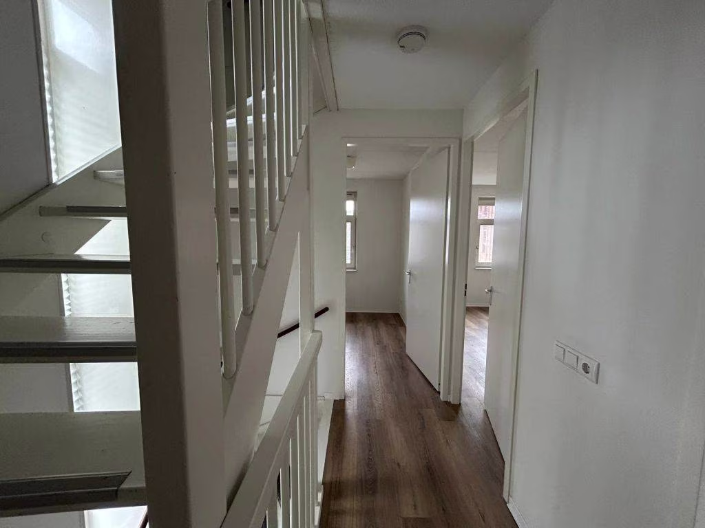 Overloop, 3 ruime slaapkamers, vaste trap naar zolder en badkamer voorzien van toilet, inloopdouche en wastafelmeubel.