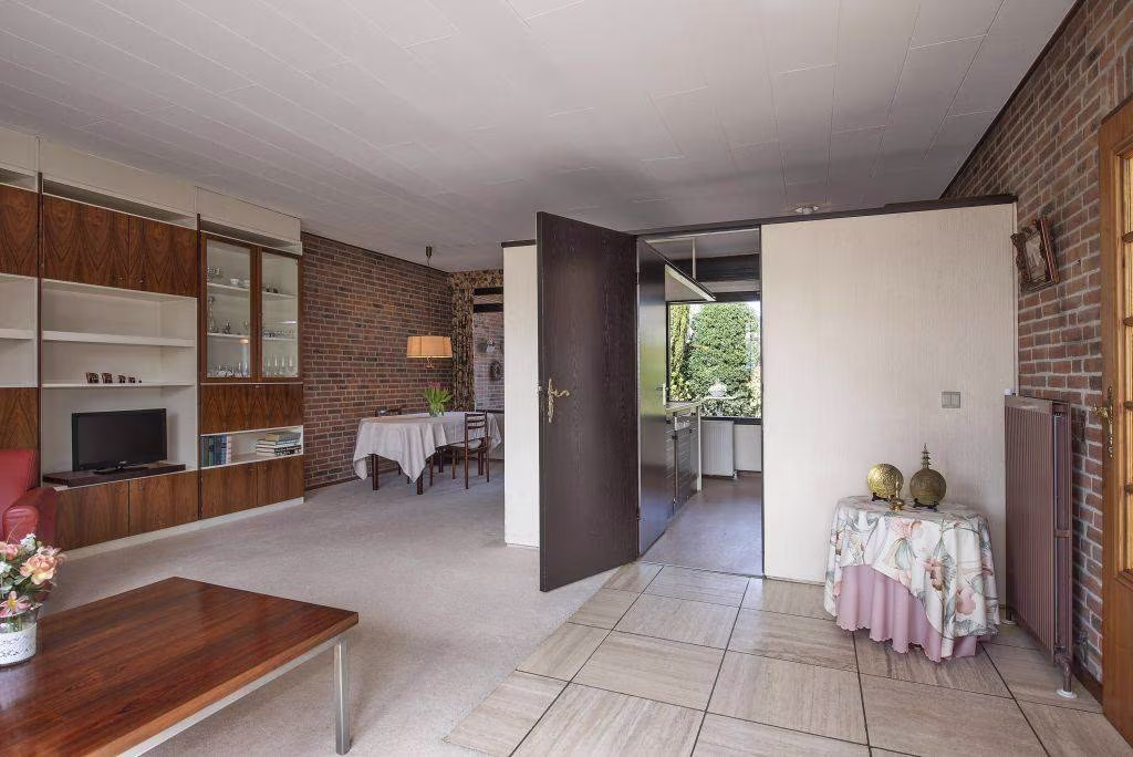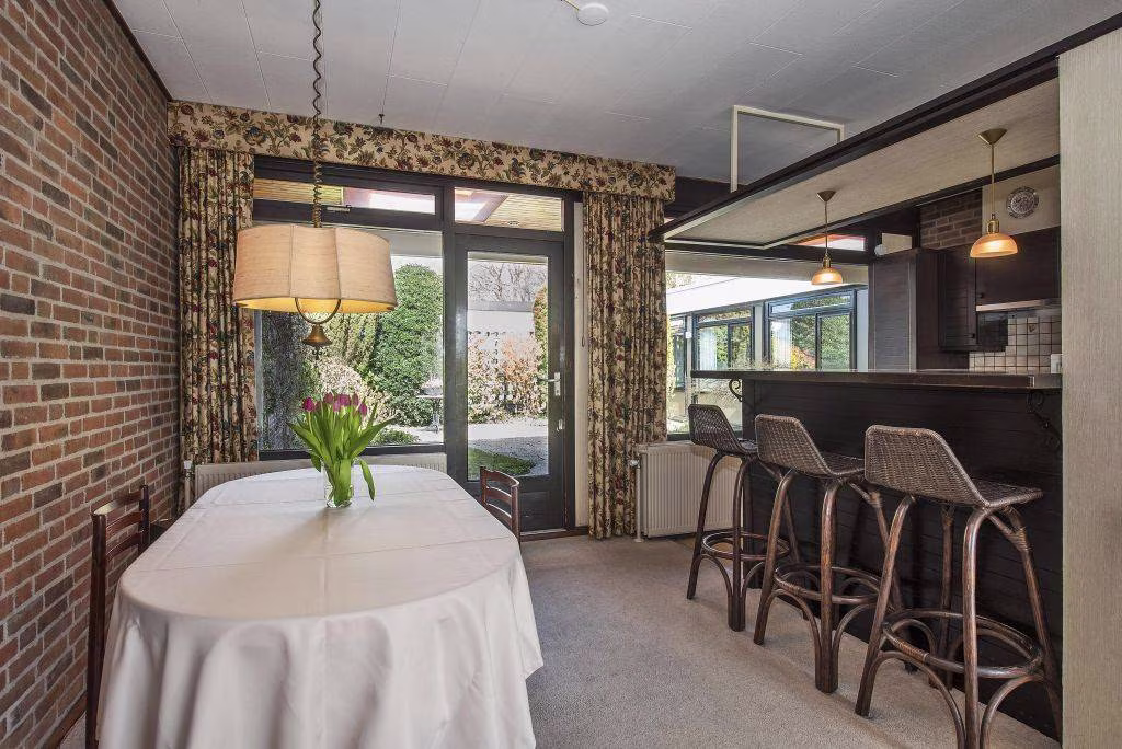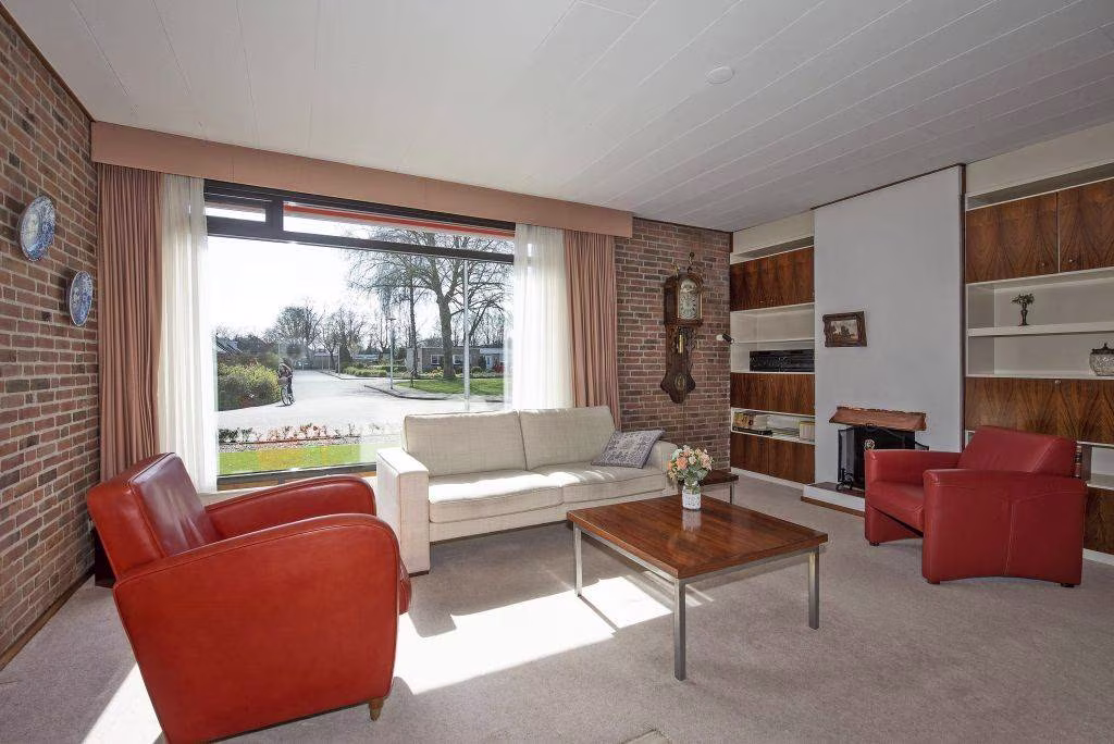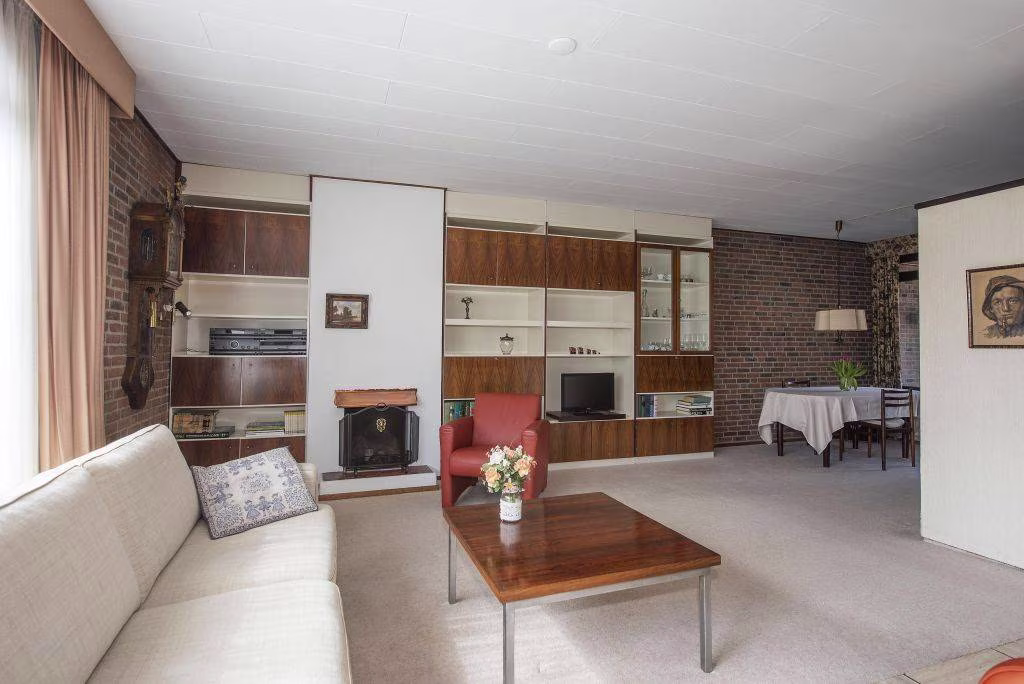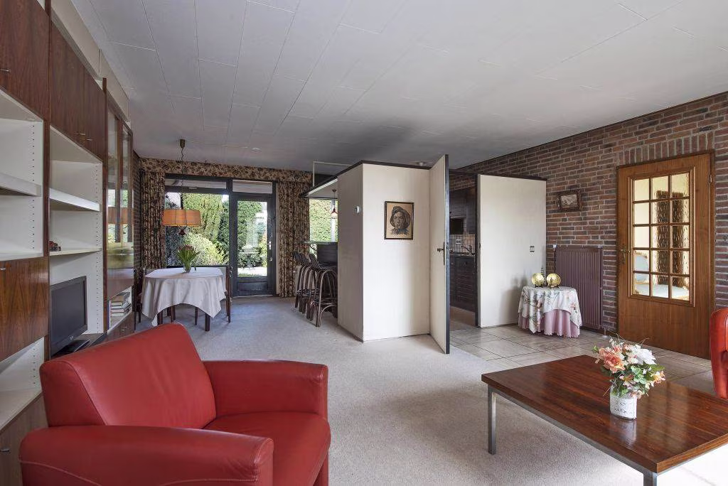Deze geschakelde bungalow uit 1969 biedt maar liefst 132 m² woonoppervlakte, volledig op de begane grond. Dat betekent comfortabel wonen zonder trappen, met alle functies binnen handbereik. De woonkamer vormt het hart van het huis, waar het daglicht via de grote raampartijen prettig naar binnen valt. Een fijne plek voor een gezellige zithoek en een eethoek waar je samenkomt met familie of vrienden.