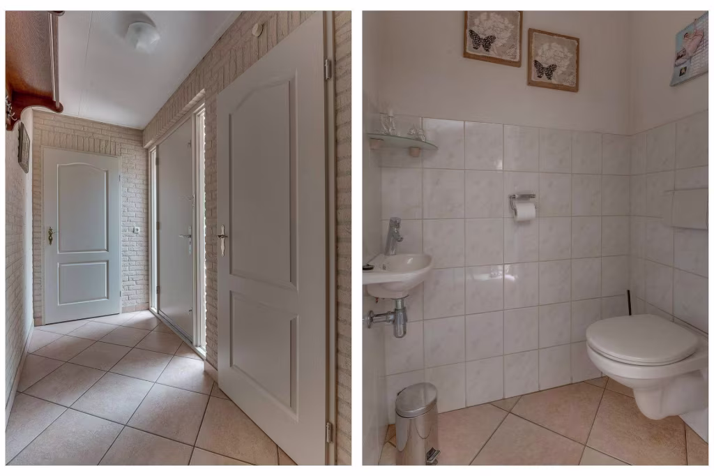 Entree, ruime hal, trapopgang, toilet met fontein, slaap/ hobbykamer, badkamer met inloop cabinedouche, wastafel met meubel, inloop provisiekast, open woon-eetkeuken, aansluitende dubbele tuindeuren naar overdekt terras, grote gezellige serre met dubbele tuindeuren naar de tuin, doorloop naar de werkruimte met eigen entree bestaande uit cateringkeuken en trimsalon.