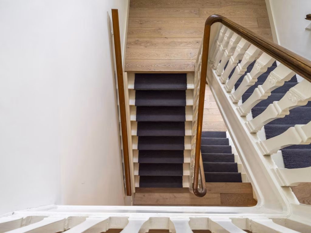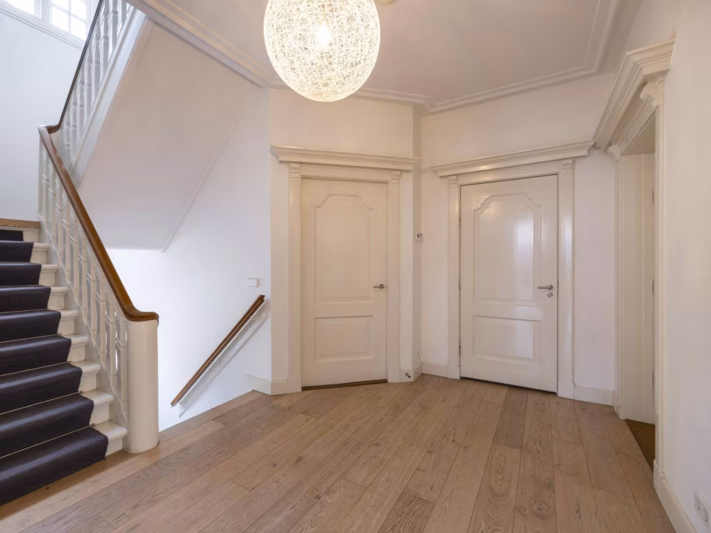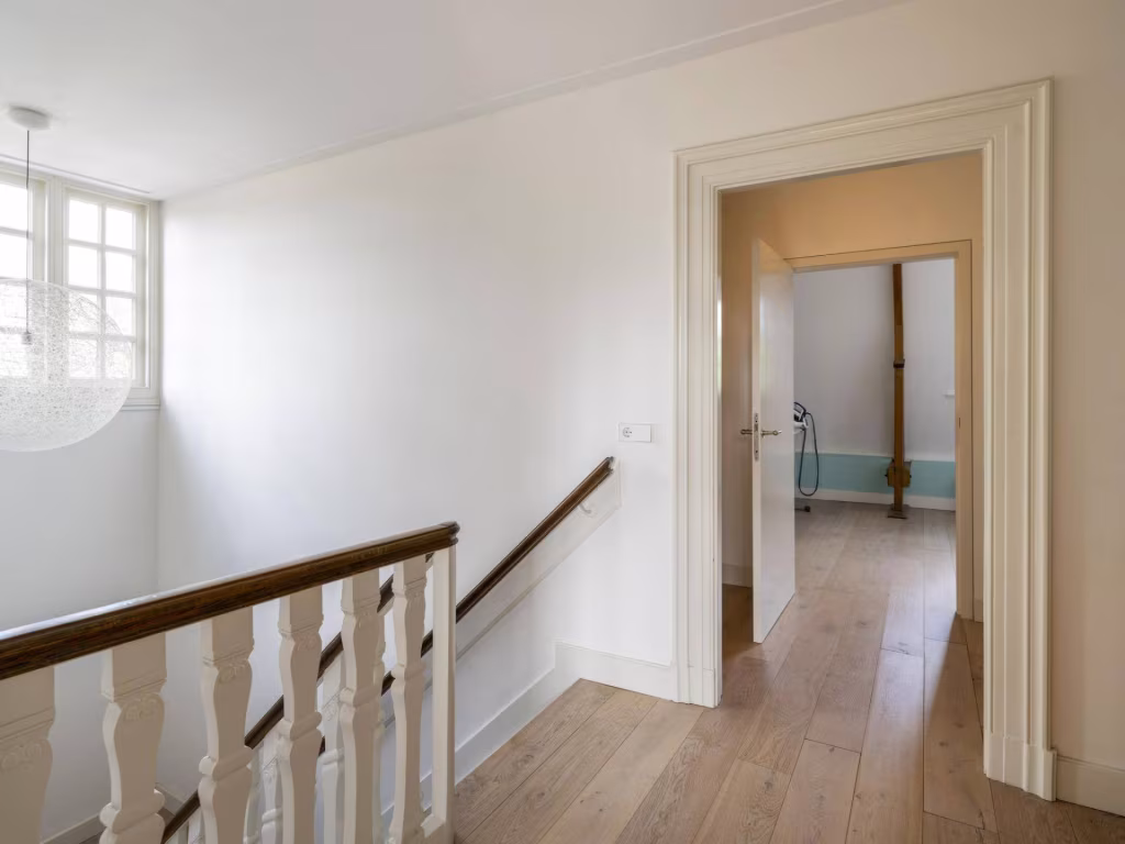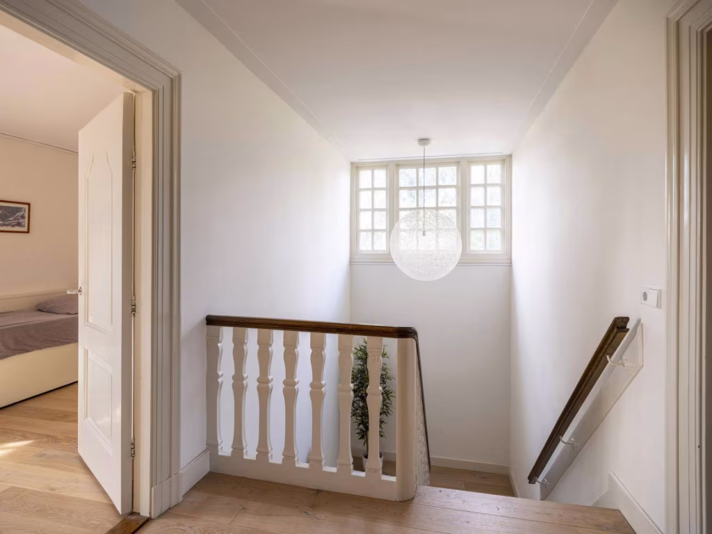 De majestueuze trap met sierlijke, rondlopende trapleuningen voorzien van oorspronkelijk houtsnijwerk is een monument op zich. Schrijd over de traploper opwaarts en je komt uit op een overloopje met een groot raam en nog een klein trapje. Dit is de opgang naar de eerste verdieping welke wordt verlicht middels een (de tweede) ronde designlamp. In diverse slaapkamers sieren bolvormige lampen de plafonds. Deze zijn eveneens identiek aan elkaar maar kleiner en anders van uiterlijk dan de lampen in de hal en de overloop.
