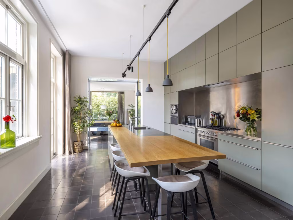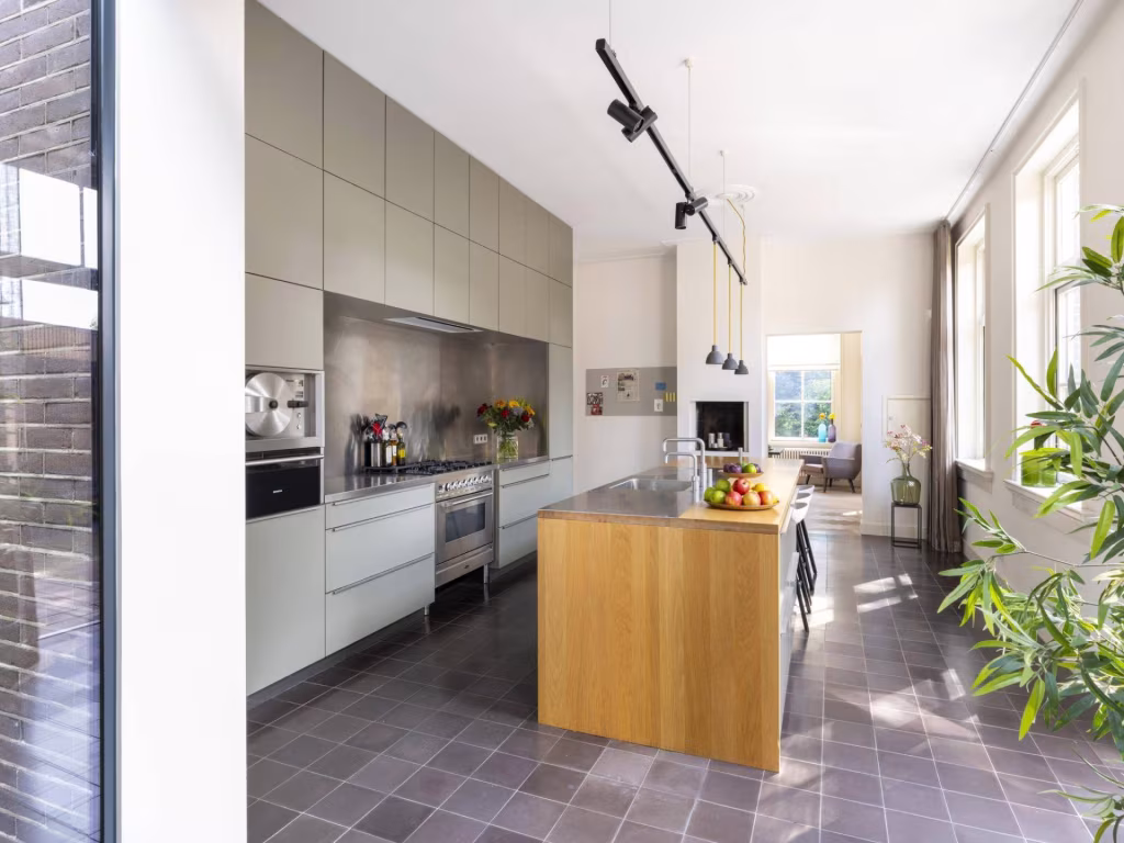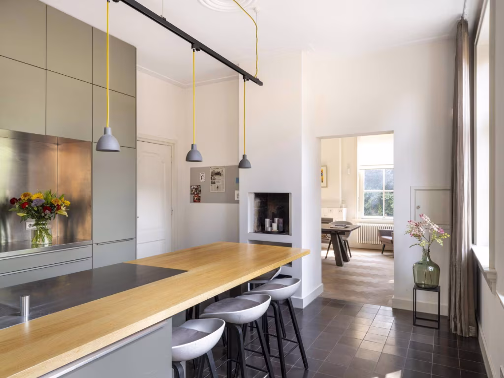 Vanuit de eetkamer loop je de keuken in. De grote, hoge ramen bieden uitzicht op het terras en de tuin. Ook hier een sobere, prettig rustgevende interieurbasis. De kleine, grijze, antiek ogende vloertegels zijn originele handgemaakte Castelo tegels met vloerverwarming; hoe aangenaam! Ze hebben dezelfde grijstint als de imponerende kastenwand met grote koelkast, vershoudlades, stoomoven, warmhoudlade en keukenkasten tot aan het plafond. Een RVS-nis in het midden van de wand is de plek voor het 6-pits gasfornuis met oven. Het fornuis wordt geflankeerd door ruime, diepe korflades met aan de rechterkant ook nog eens een weggewerkte apothekerskast. Van gebrek aan opbergruimte is in de praktische keuken beslist geen sprake. Wanneer je van koken je hobby hebt gemaakt, is dit het culinaire Walhalla. Er is voldoende ruimte om samen recepten voor de lekkerste gerechten uit te proberen.