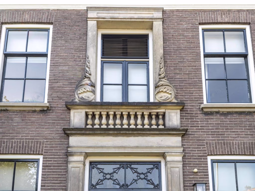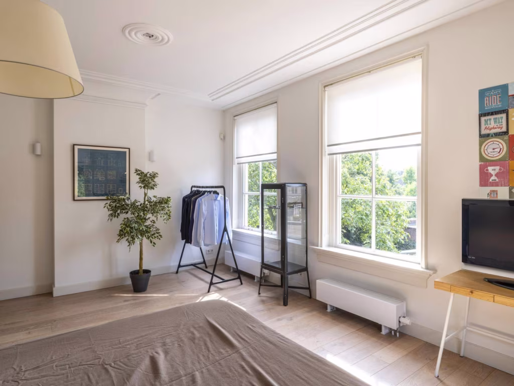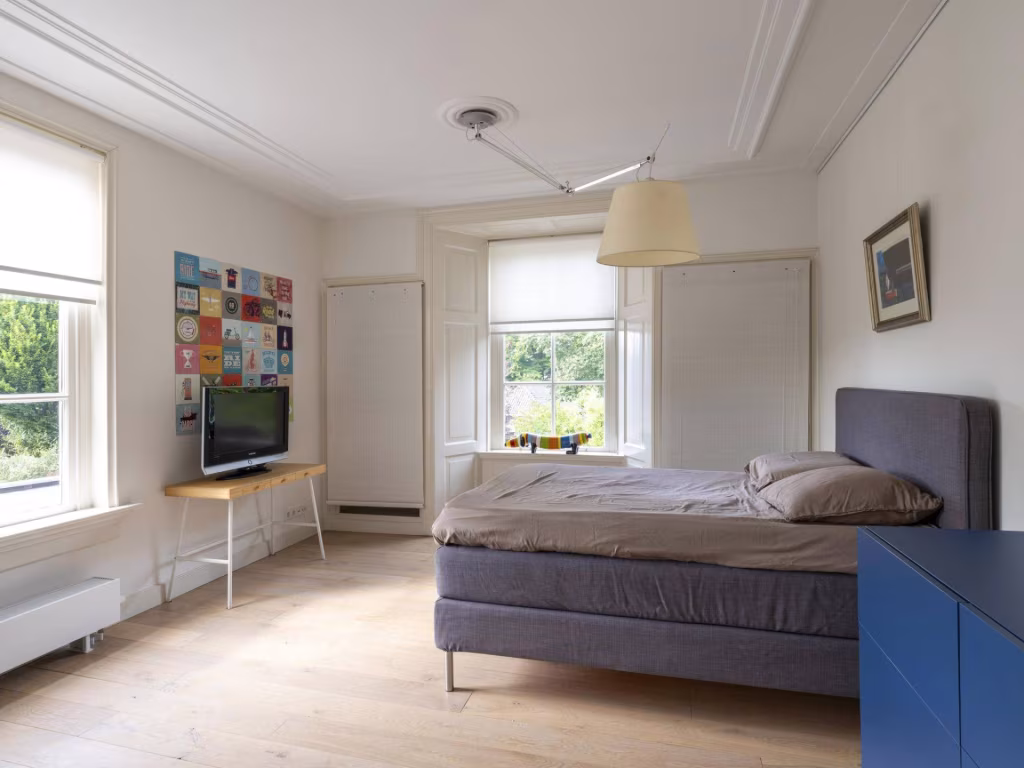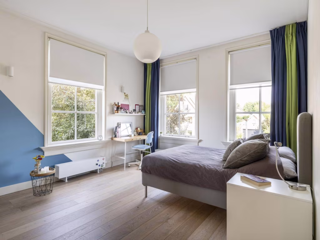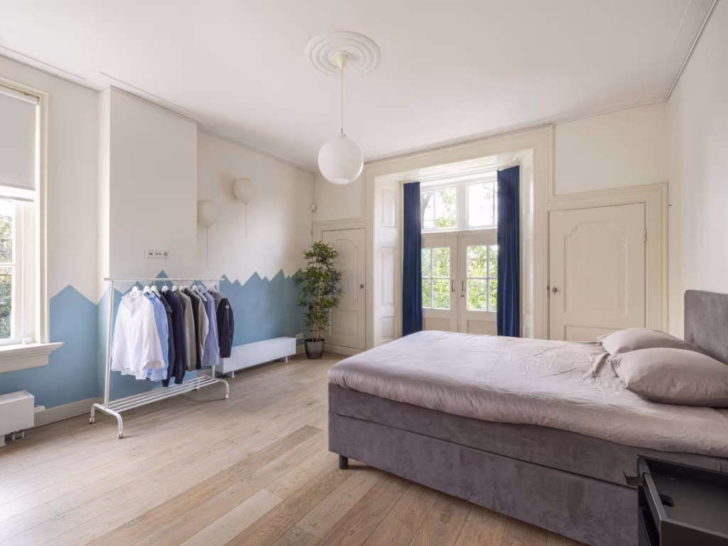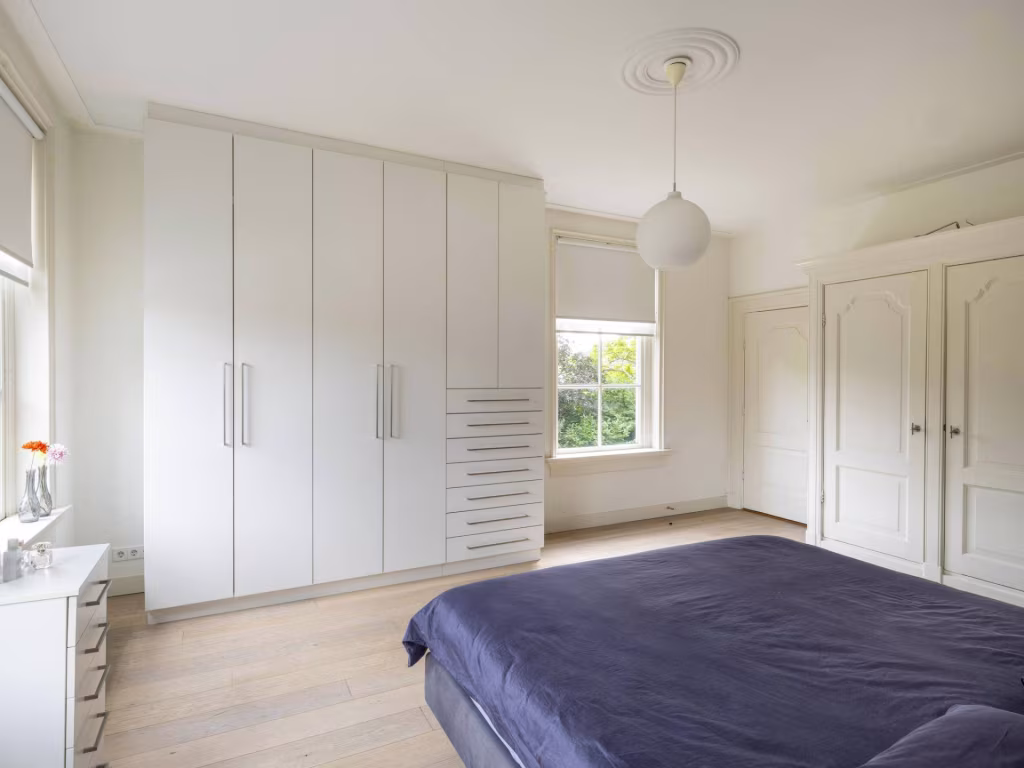 De route volgend kom je bij de volgende sublieme kamer, slaapkamer 5. Daglicht komt er door drie ramen naar binnen. Een hedendaagse kledingkast vult de hang- en legruimte in de monumentale inbouwkasten aan. Geen overbodige accessoires, wel rust. En dat is precies genoeg om hier volledig tot rust te komen.