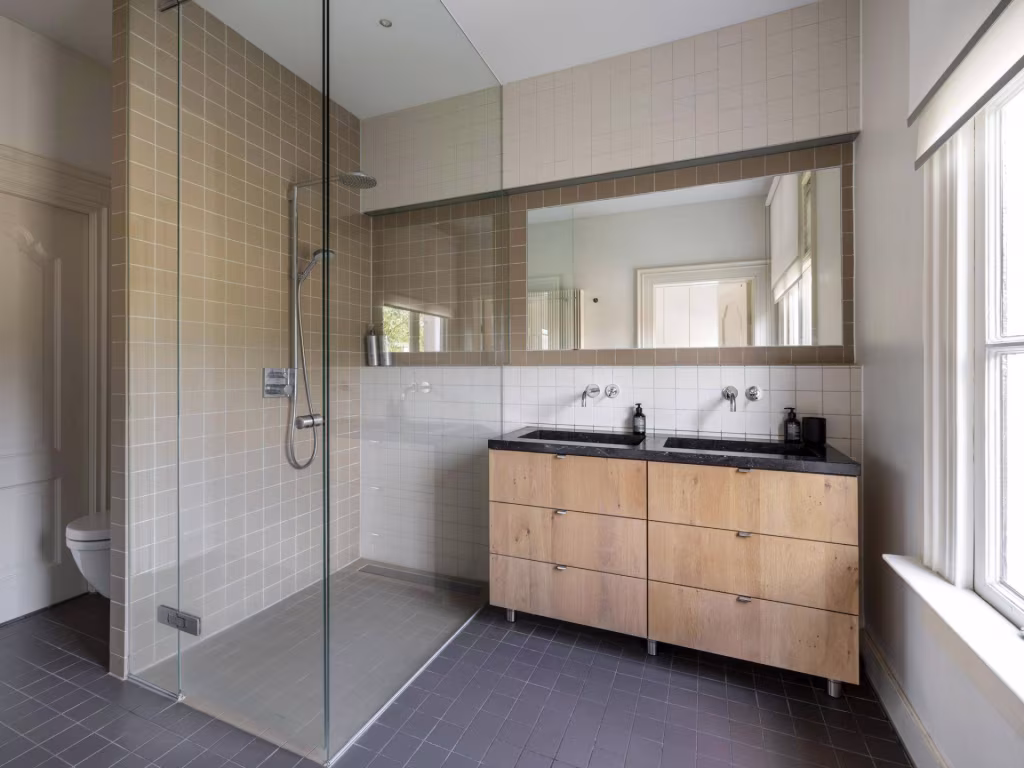 Achter de tweede deur bevindt zich de badkamer met een raam, ruimtelijk gezien boven de entree beneden. De badkamer—uitgevoerd in een combinatie van witte en bruine tegels—is uitgerust met een hangend toilet, een douchegelegenheid achter glazen wanden, een badmeubel met opberglades, een dubbele wastafel van zwart natuursteen en inbouwkranen. De brede spiegel erboven is omlijst met dezelfde bruine tegels als de wand in de doucheruimte.