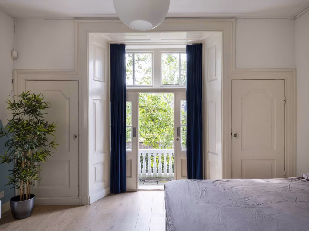 De derde slaapkamer is te bereiken via de derde en de vierde deur. Bij helder weer kan de lamp in dit slaapvertrek bijna uitblijven. Met een grote raam en openslaande balkondeuren nemen daglicht en de zon die dankbare taak voor hun rekening. Vanaf het kleine balkon kijk je uit over de achtertuin. In deze kamer keert de symmetrie terug in de vorm van kasten aan weerskanten van de balkondeuren.