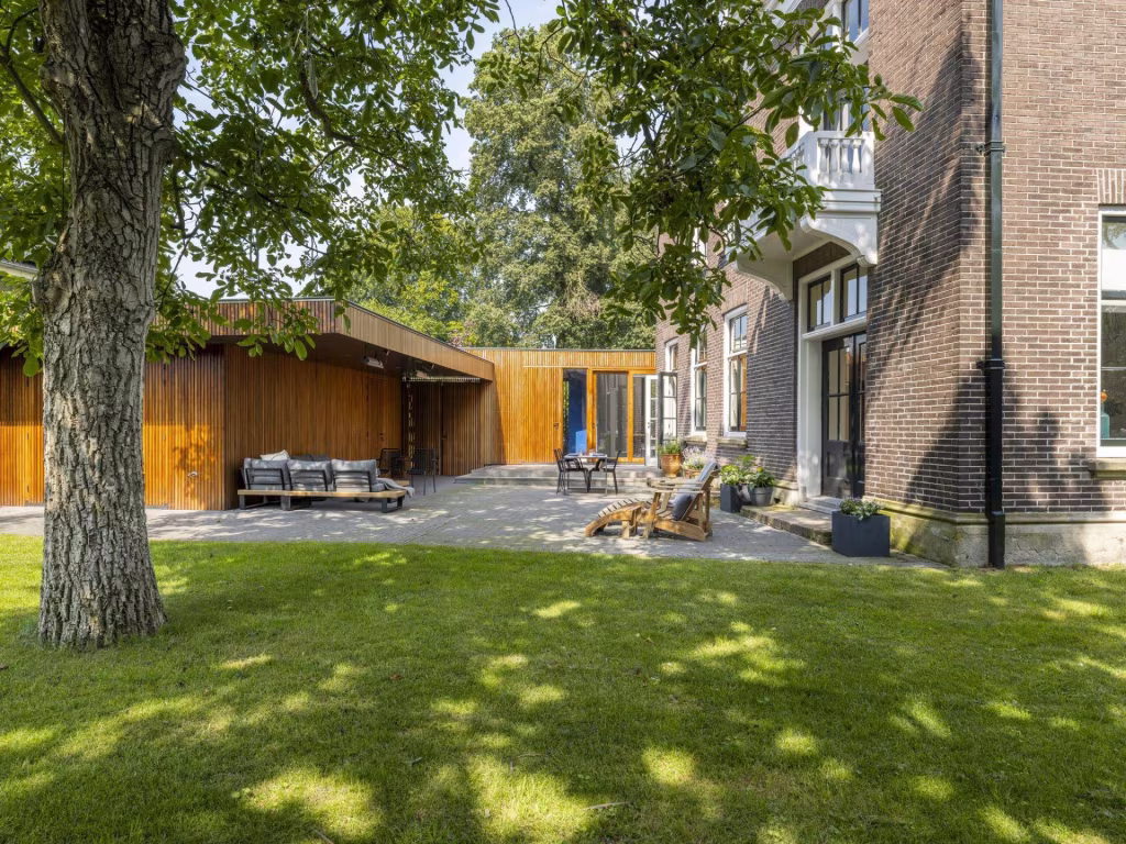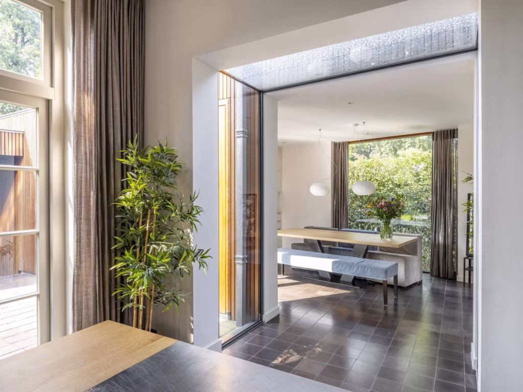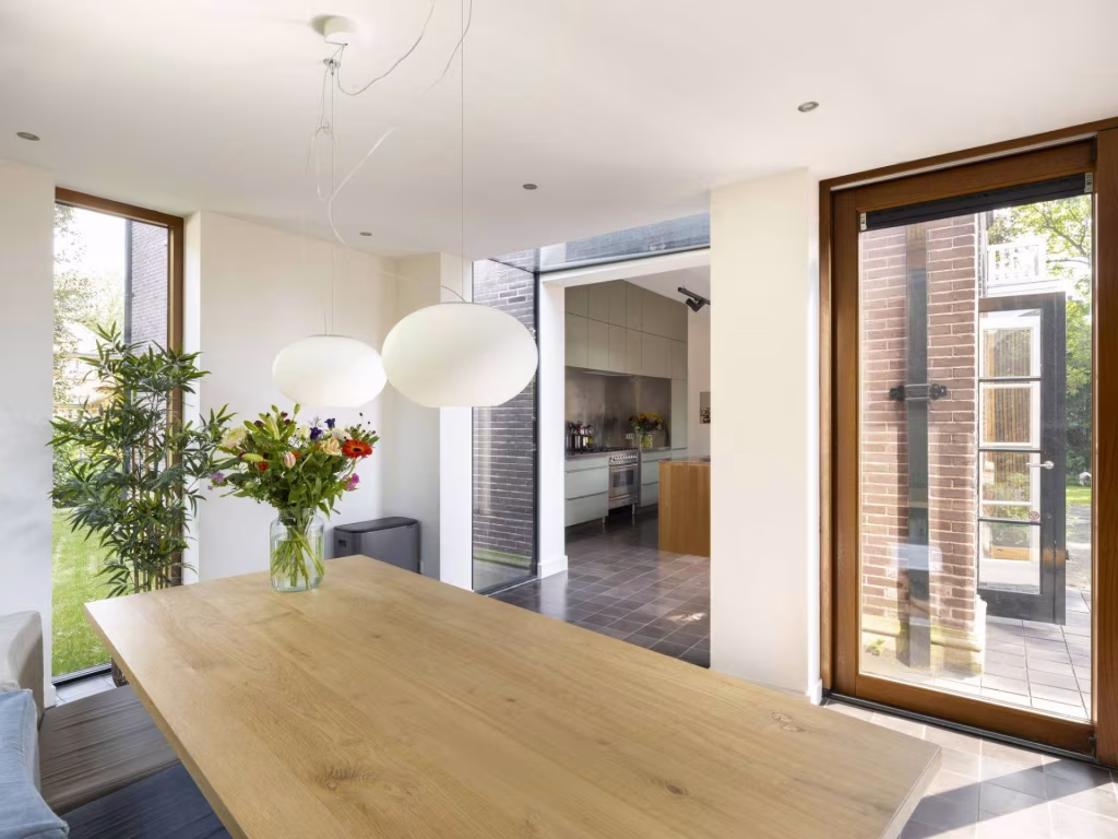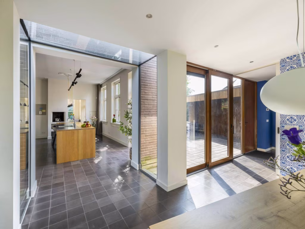 Aangrenzend aan de keuken is in 2015 een uitbouw gecreëerd. De doorloop is volledig van glas en komt uit in de tweede eetkamer. Met respect voor het monumentale karakter van het woonhuis, is de ruimte grotendeels hetzelfde ingericht als de rest van de benedenverdieping. Dezelfde tegelvloer als in de keuken, wit gestucte muren en hoge ramen. Het grote verschil zit ‘m in de stijl. Zo zijn de binnenkozijnen van hetzelfde hout als de exterieure houten panelen. De ruimte wordt verlicht middels plafondspots en hanglampen en beschikt over een kastruimte voor een ‘Delftsblauw’ behangen wand die er de toon zet als knipoog naar de historie.