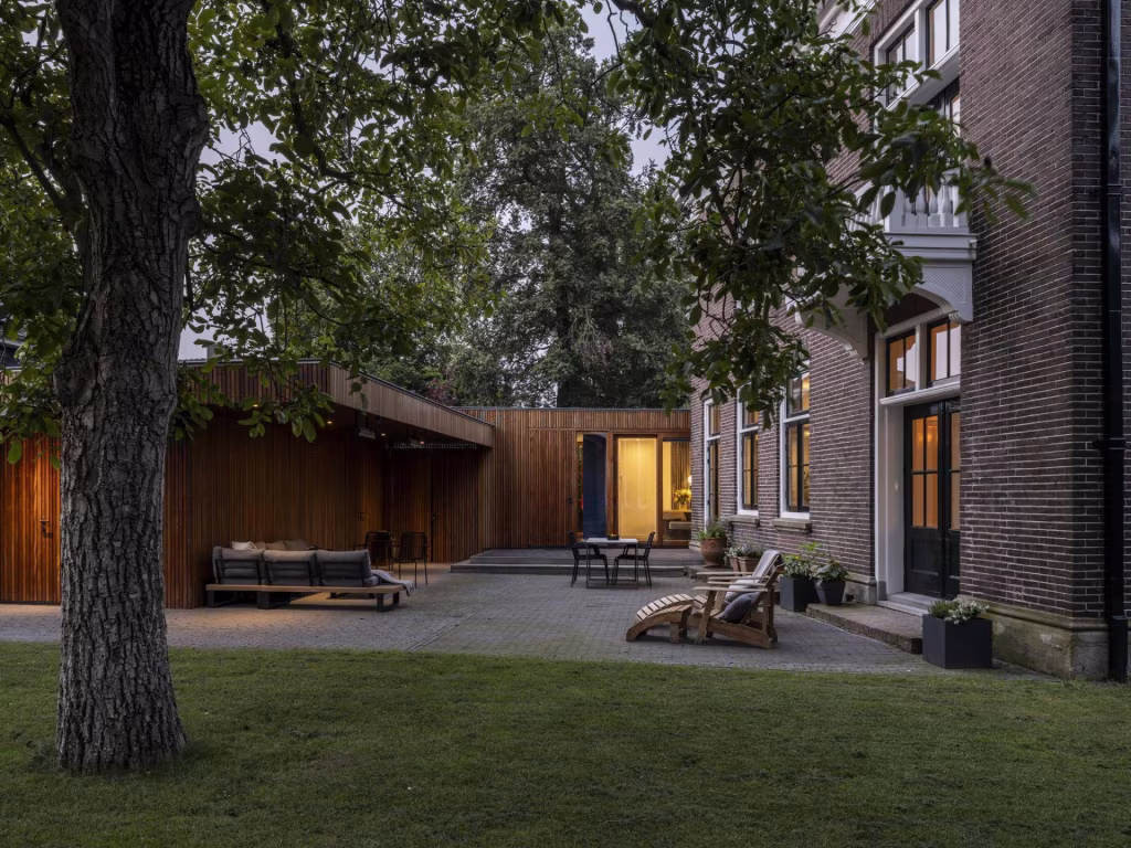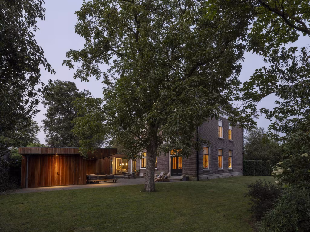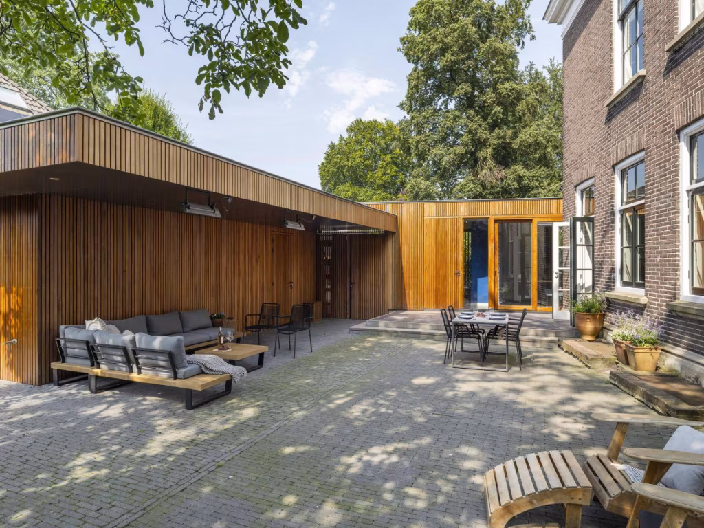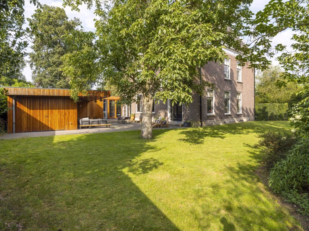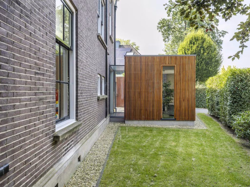Aangrenzend aan de keuken is in 2015 een uitbouw gecreëerd. De doorloop is volledig van glas en komt uit in de tweede eetkamer. Met respect voor het monumentale karakter van het woonhuis, is de ruimte grotendeels hetzelfde ingericht als de rest van de benedenverdieping. Dezelfde tegelvloer als in de keuken, wit gestucte muren en hoge ramen. Het grote verschil zit ‘m in de stijl. Zo zijn de binnenkozijnen van hetzelfde hout als de exterieure houten panelen. De ruimte wordt verlicht middels plafondspots en hanglampen en beschikt over een kastruimte voor een ‘Delftsblauw’ behangen wand die er de toon zet als knipoog naar de historie.