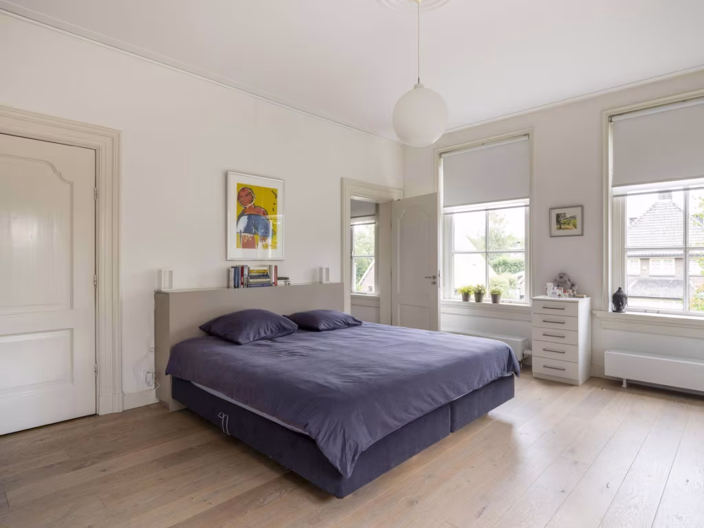 Hier verpozen voelt als een verblijf in een luxe hotel. Deze riante slaapkamer (boven de eetkamer en suite op de benedenverdieping) telt drie hoge raampartijen. Een ervan maakt onderdeel uit van een chique, met houten wandplaten afgewerkte erker. Volgens goed gebruik met inbouwkasten, zowel links als rechts van de erker. Waarlijk schitterend is het plafond dat hier is voorzien van authentieke plafondlijsten en ornamenten.