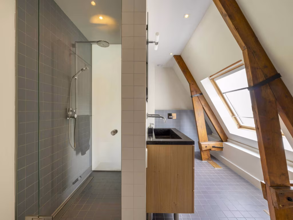 Deze badkamer heeft een robuust karakter dankzij de oude, houten dakspanten die in het interieur zijn opgenomen. Sfeerbepalend is hier tevens de schuine wand, voorzien van een dakraam. In de hoek van de badkamer trekt een ovaal ligbad de aandacht. Ontspannen badderen doe je hier letterlijk in hogere sferen. Een wastafelmeubel met lades, een zwarte, dubbele wastafel in één, twee inbouwkranen en een brede spiegel beschenen door een wandspot, zijn geplaatst voor een wand. Erachter is een inloopdouche met inbouwspotjes ingericht. Alle wanden en vloeren zijn betegeld met dezelfde vierkante, grijze tegeltjes.