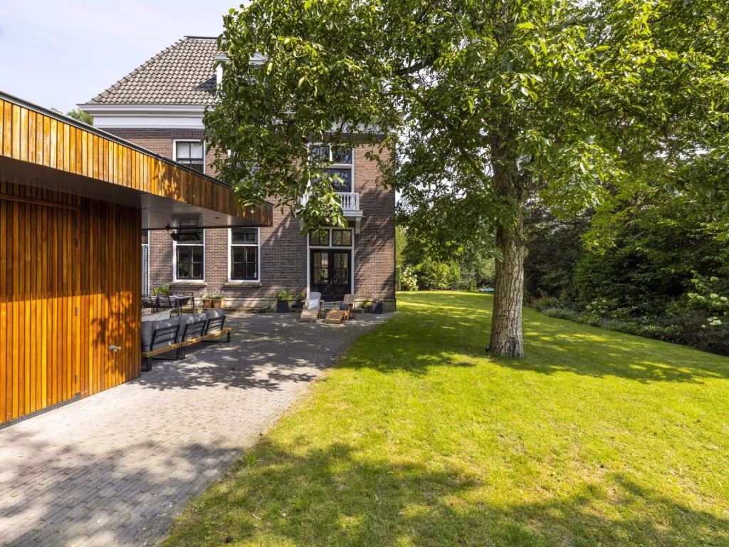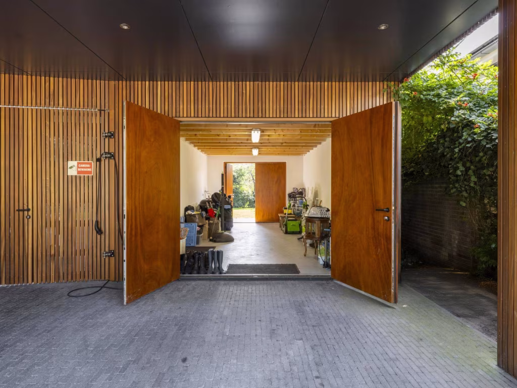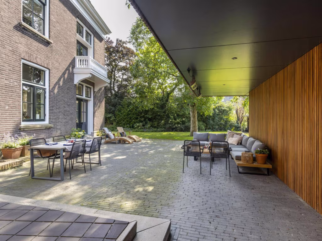 Denk je aan een gezellige tuin dan denk je aan fruitbomen, een uitgestrekt gazon, een zitje in de zon en een overdekt terras voor koele avonden. Deze tuin, bereikbaar via de eetkamer, de keuken en de uitbouw, heeft het allemaal. Inclusief perenboom. Passend bij de stijl van de villa bestaat de bestrating uit oude waaltjes. Aan de zithoek in de buitenlucht, vanaf de ligbedden of op het overdekte terras aan de garagewand is het zalig bijkomen na een drukke dag. Vanaf hier heb je zicht op de tuin, de achtergevel van het huis en de uitbouw. Is het je buiten al snel te fris? Geen nood, doe de heaters aan en je kunt urenlang genieten van mooie avonden. In de hoek van de tuin kun je onder een overkapping plaatsnemen op een derde terras.
