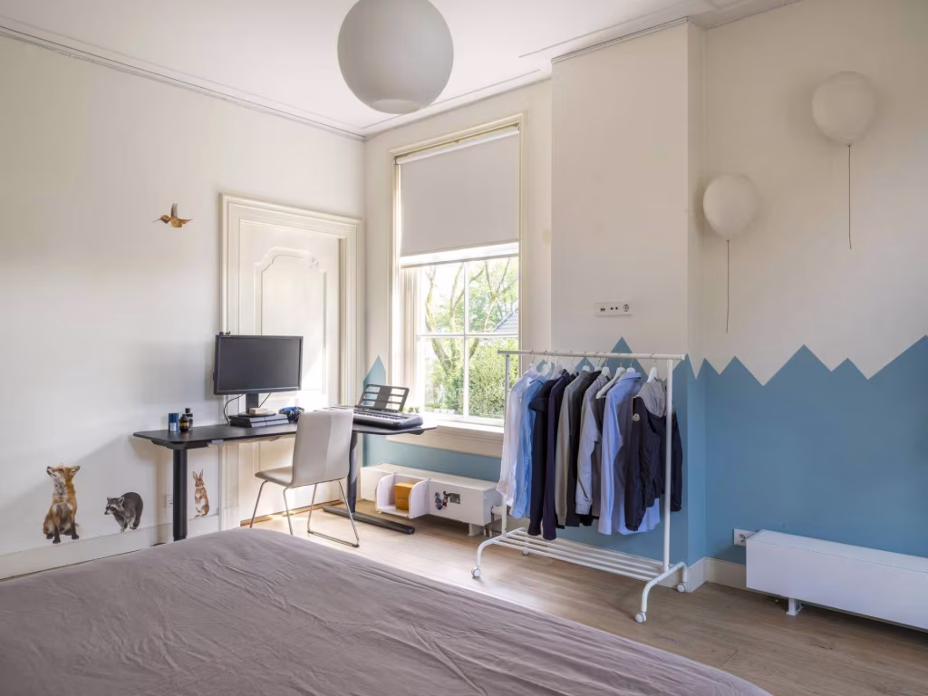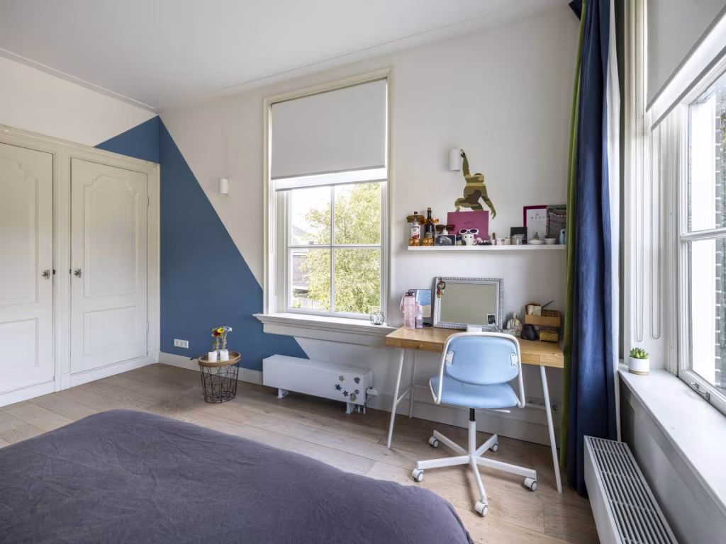 Aan de rechterkant vind je de eerste kamer met drie hoge ramen. De voormalige werkkamer dient tegenwoordig als ‘chillkamer’, maar is ook als slaapkamer uitermate geschikt. Naast de twee monumentale inbouwkasten is er een derde kast die plek biedt aan de waterontharder.