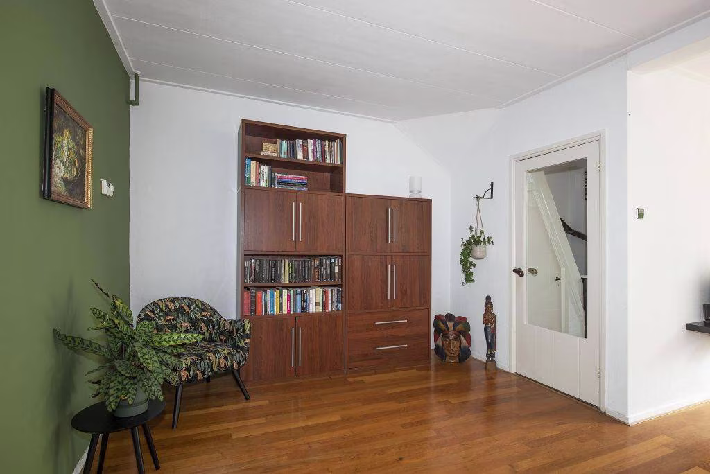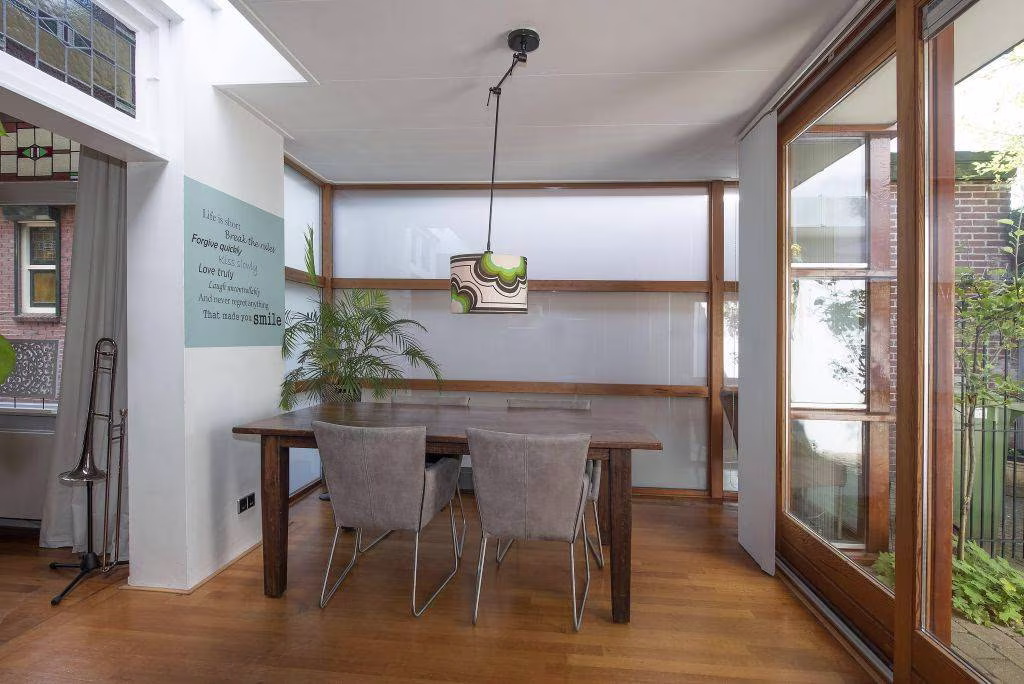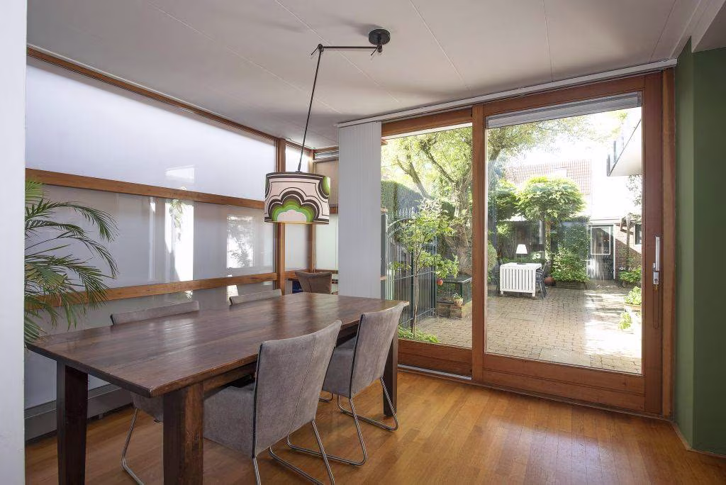 Bij binnenkomst stap je in een originele entree, compleet met toilet en trapopgang. Vanuit hier bereik je de voorkamer, die via de tussenkamer verbonden is met een gezellige zithoek. Achterin ligt de royale eethoek, gesitueerd in de uitbouw met grote ramen en houten kozijnen. Dit geeft de ruimte een warme sfeer én veel daglicht: een heerlijke plek om samen te tafelen.