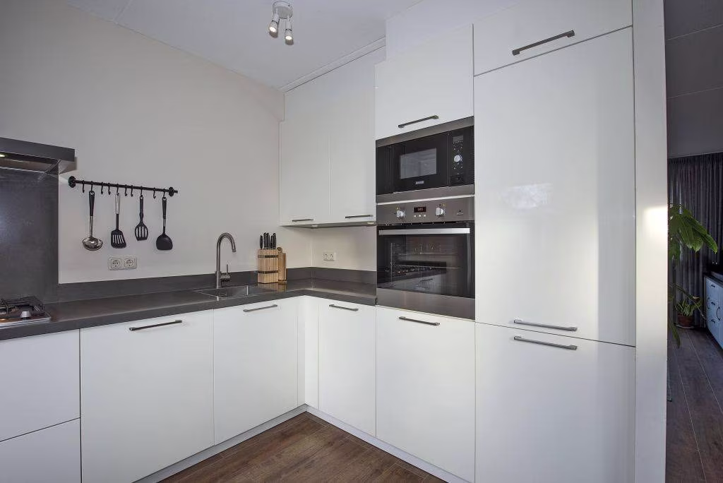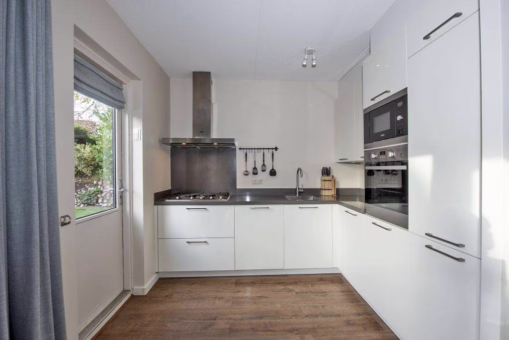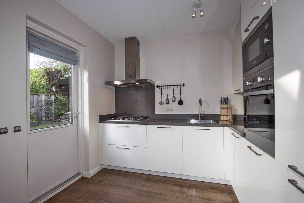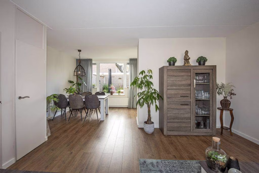 De woonkamer biedt volop ruimte voor een fijne zit- en eethoek, terwijl de open keuken aan de achterzijde het hart van het dagelijks leven vormt. Vanuit hier stap je gemakkelijk de tuin in.