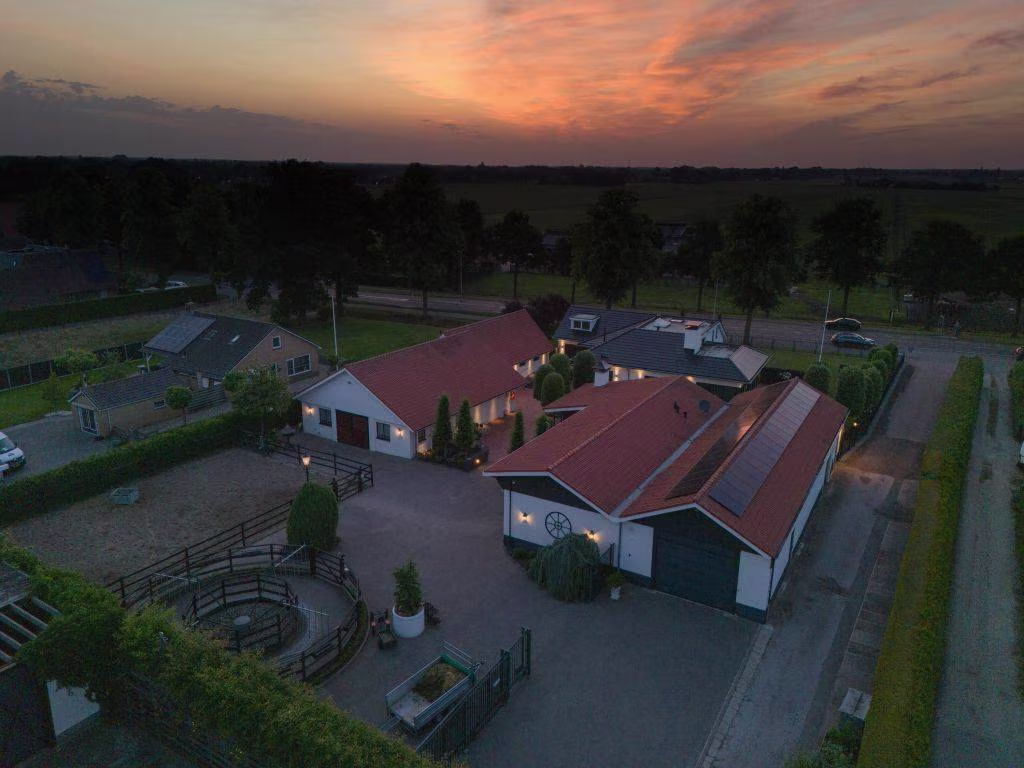 Het erf is overzichtelijk en doordacht ingericht. Je beschikt over vier goed onderhouden paardenstallen met voldoende ventilatie en daglicht. Daarnaast is er een ruime paddock en een stapmolen. De siertuin rondom de woning is fraai aangelegd met diverse terrassen, een verzorgd gazon en volwassen beplanting. De opritten zijn ruim en verhard, met volop parkeergelegenheid voor meerdere voertuigen. Alles is logisch gegroepeerd rond de woning en draagt bij aan een rustige, harmonieuze uitstraling.