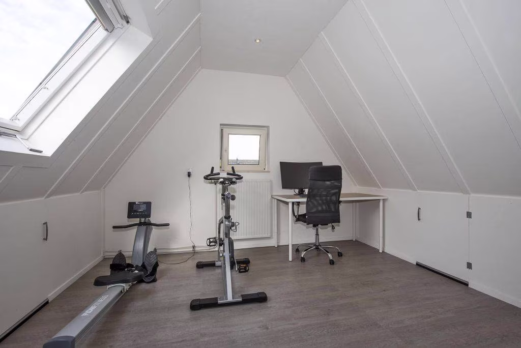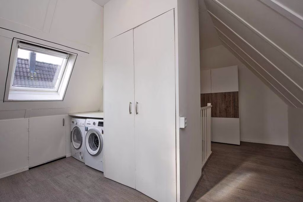 De tweede verdieping vormt een volwaardige extra woonlaag en biedt ruimte voor bijvoorbeeld een extra slaapkamer, hobbyruimte of werkplek. Dankzij de aanwezige dakramen komt er prettig daglicht naar binnen. Daarnaast is hier de aansluiting voor de wasmachine, waardoor dit een praktische plek is voor het wassen en drogen van kleding.