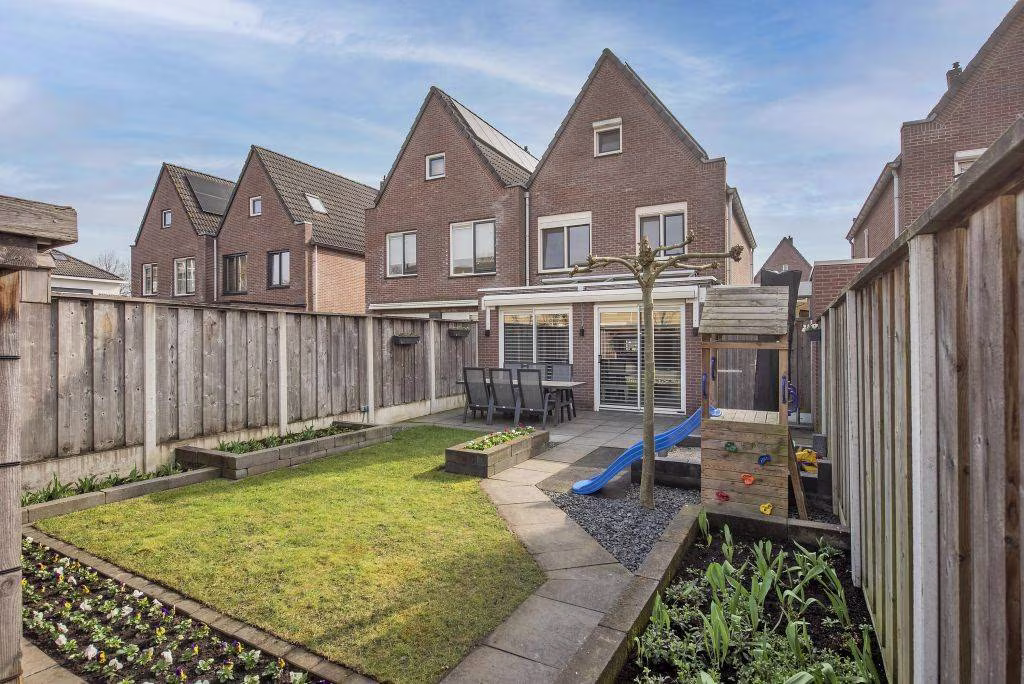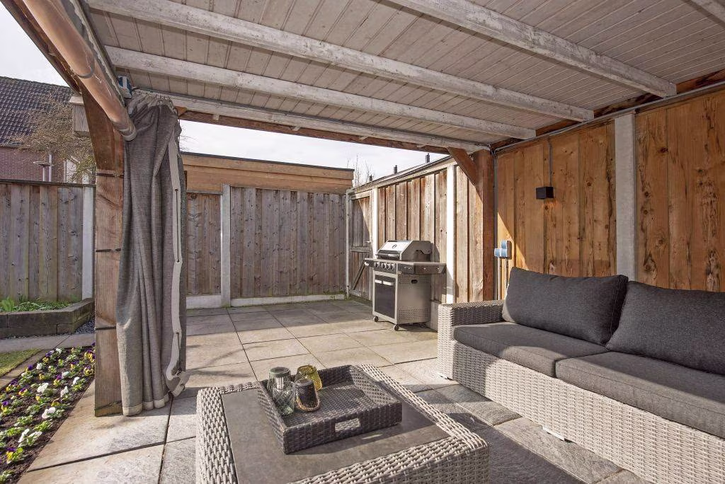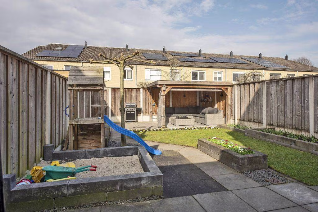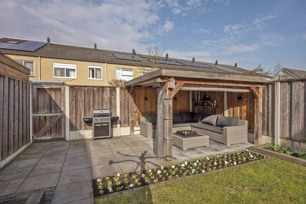 Ook buiten is het hier prettig wonen. De achtertuin is verzorgd aangelegd en beschikt over een terras, gazon en een overkapping, waardoor je hier op verschillende manieren van het buitenleven kunt genieten. Onder de overkapping kun je beschut zitten en ook op minder zonnige dagen comfortabel buiten verblijven, terwijl het gazon zorgt voor een groene en open uitstraling van de tuin. Op mooie dagen is dit een fijne plek om met vrienden of familie te ontspannen en te genieten van lange zomeravonden buiten.