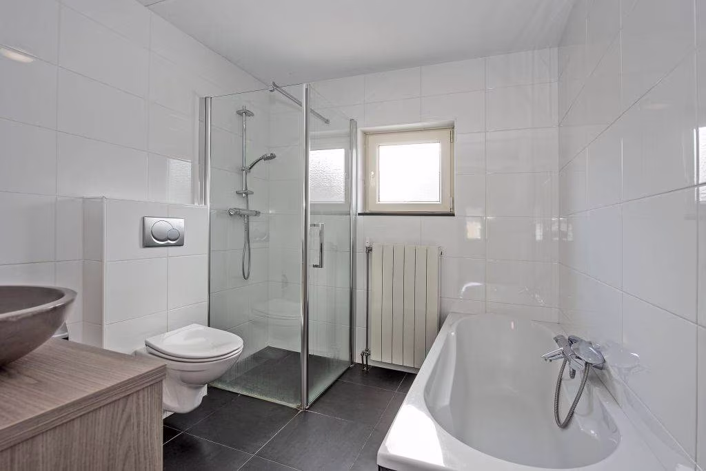 Op de eerste verdieping kom je op de overloop die toegang geeft tot drie slaapkamers en de badkamer. De badkamer is ingericht met een toilet, dubbele wastafel, inloopdouche en ligbad.