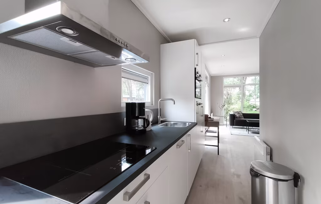 Entree/hal, open keuken voorzien van inductiekookplaat, afzuigkap, combi-oven-magnetron, koel-vriescombinatie, vaatwasser en senseo-apparaat. De woonkamer is heerlijk licht door de vele raampartijen en via de openslaande tuindeuren betreed je het terras.