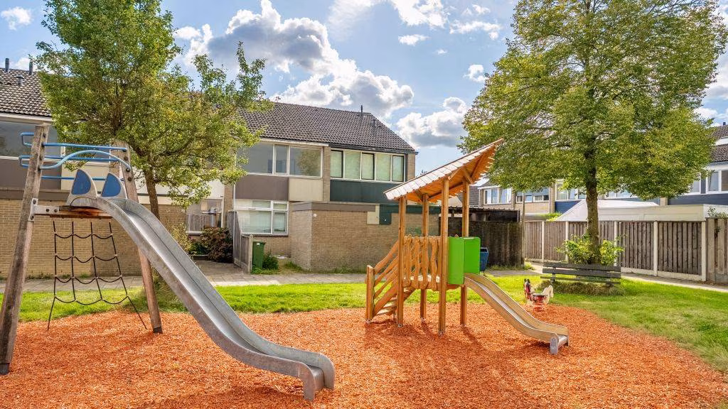 Entree, hal, meterkast, toiletruimte, ruime woonkamer met trap naar bovenverdieping, provisiekast en keuken met inbouwapparatuur gericht op de kinderspeelplaats.