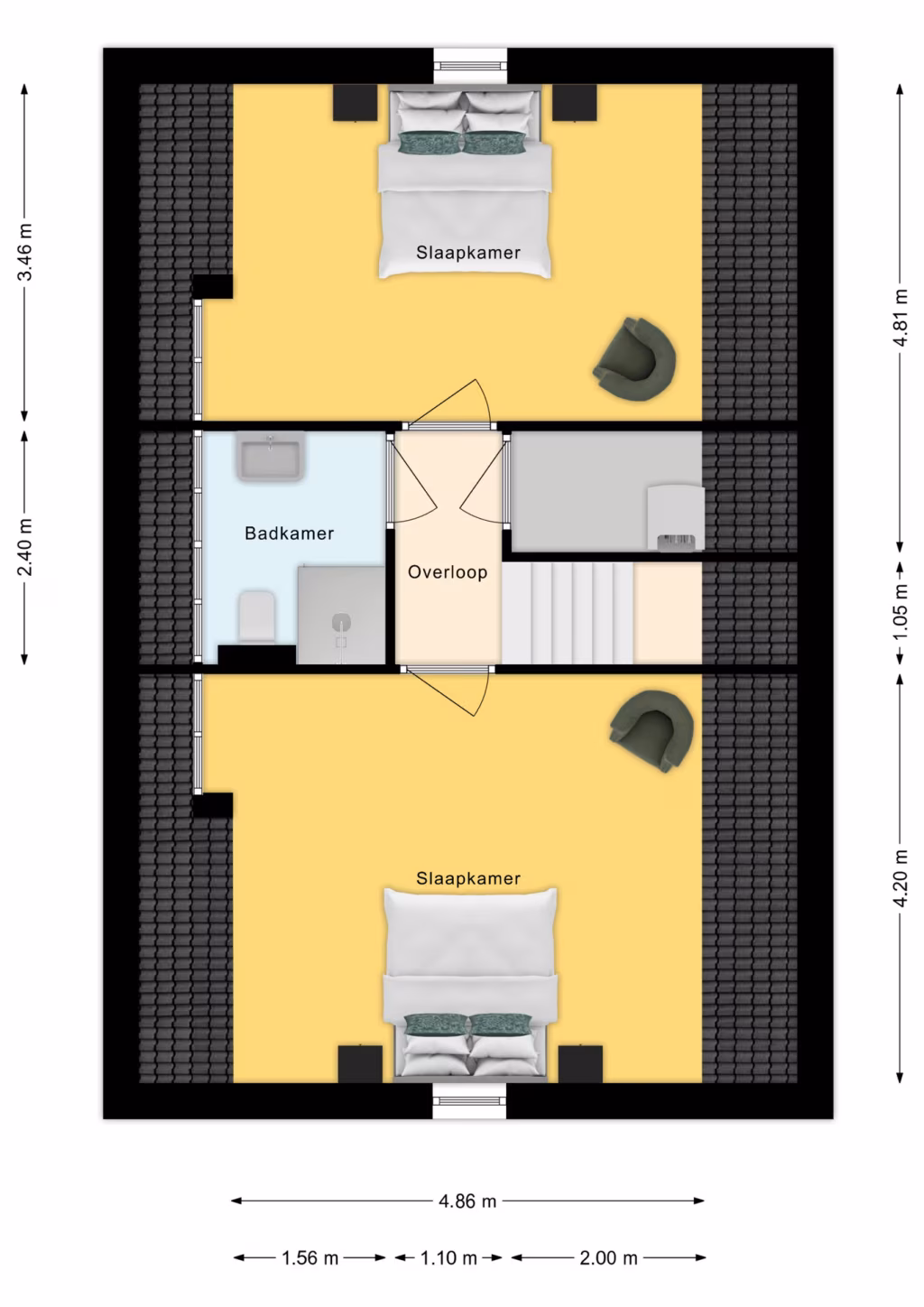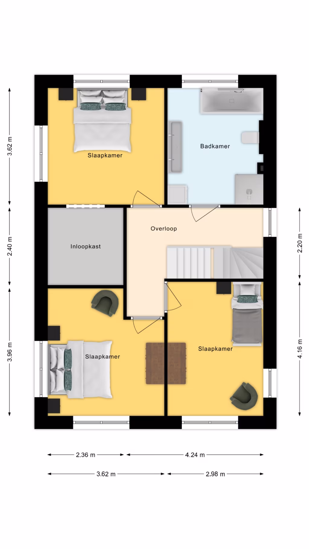 De eerste verdieping beschikt over drie comfortabele slaapkamers. De royale master bedroom heeft een eigen inloopkast. Daarnaast is er een moderne badkamer aanwezig. Alle vertrekken zijn bereikbaar vanaf de overloop, waar ook de vaste trap naar de tweede verdieping is geplaatst.