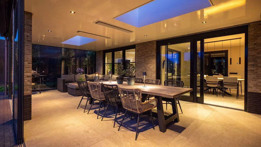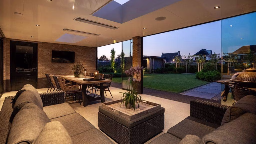 * Groot overdekt terras voorzien van geluidsspeakers, glazenwand en heaters