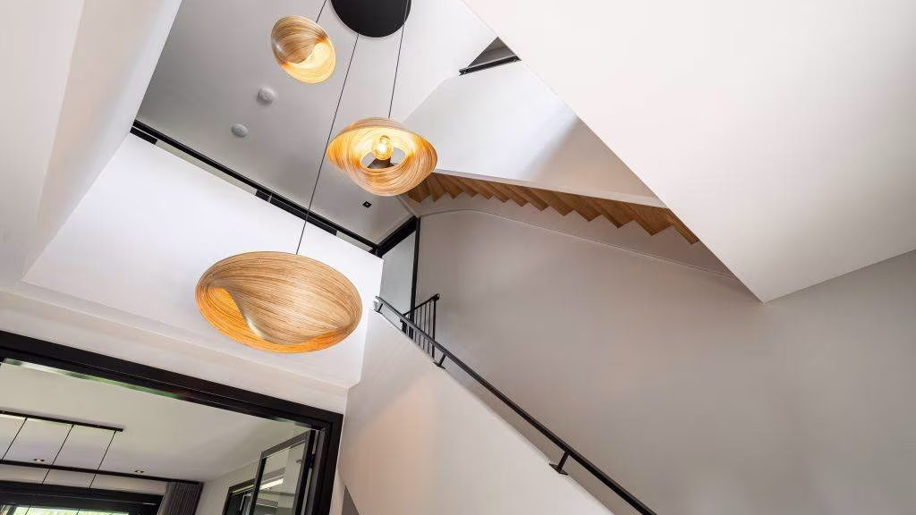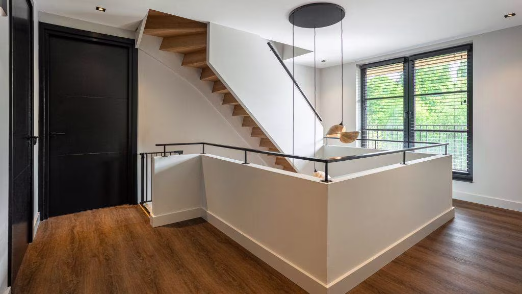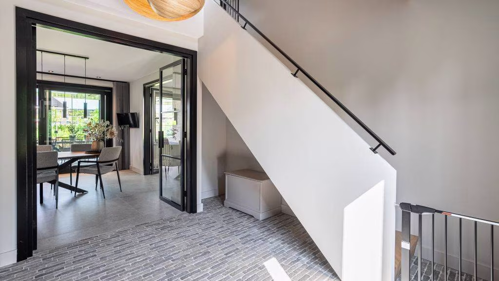 De entree maakt direct indruk: een ruime hal met een stijlvolle stenen vloer, hoge vide en een prachtige lichtinval zet direct de toon. Hier bevinden zich het moderne toilet en de toegang tot het kantoor aan huis, ideaal voor werken in alle rust. De woonkamer heeft een open, maar tegelijkertijd intieme indeling en kan door middel van elegante taatsdeuren worden afgescheiden van de woonkeuken. De leefkeuken vormt het hart van de woning en is uitgevoerd met hoogwaardige inbouwapparatuur, waaronder een inductiekookplaat, Quooker, vaatwasser, oven, magnetron en koelkast. Er is volop bergruimte en via de keuken is de bijkeuken bereikbaar, met extra opslagmogelijkheden en directe toegang tot de volledig geïsoleerde garage. De begane grond ademt luxe en comfort en is perfect geschikt voor zowel dagelijks wonen als het ontvangen van gasten.