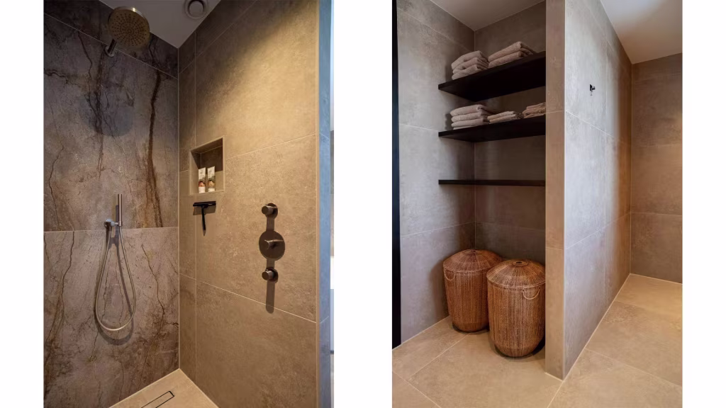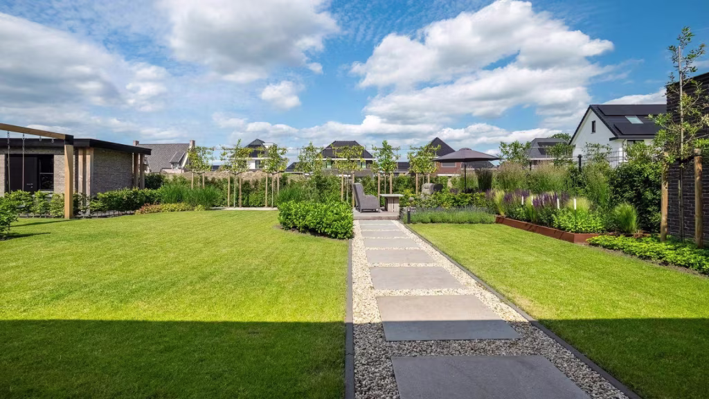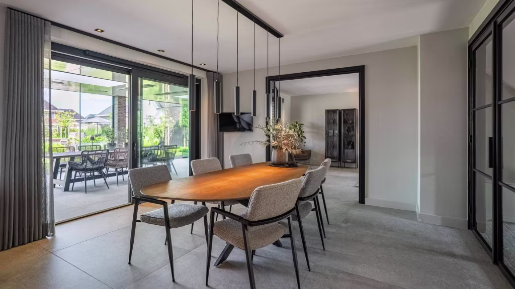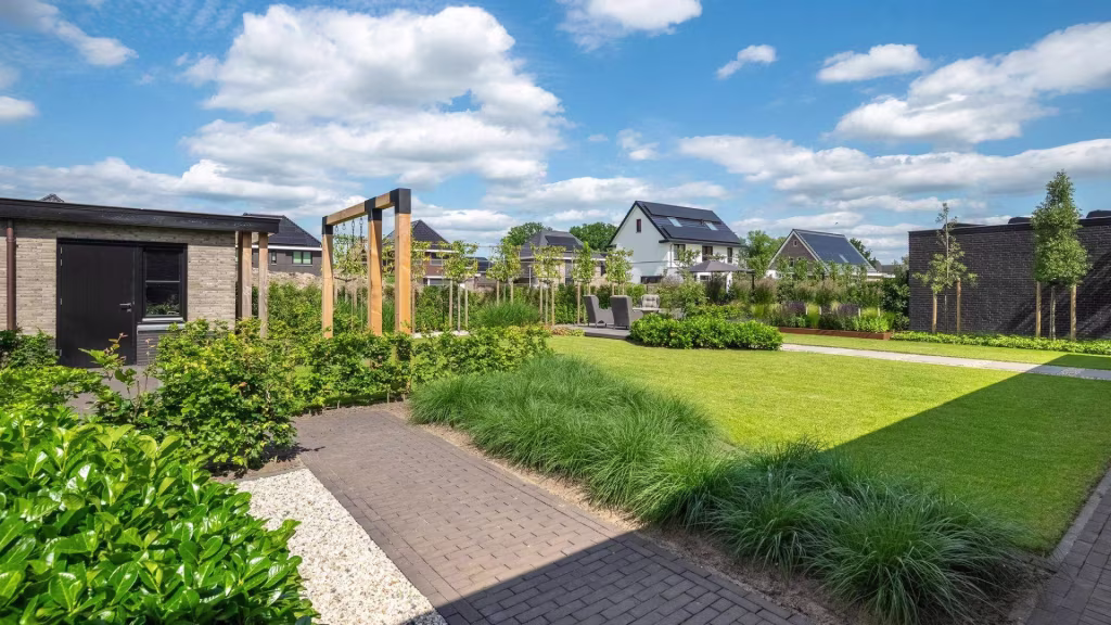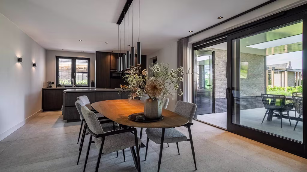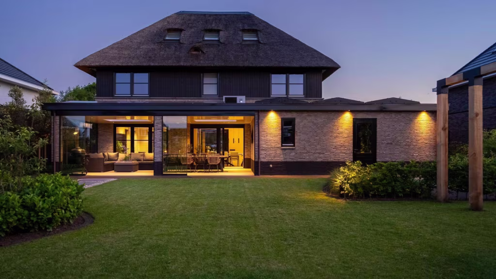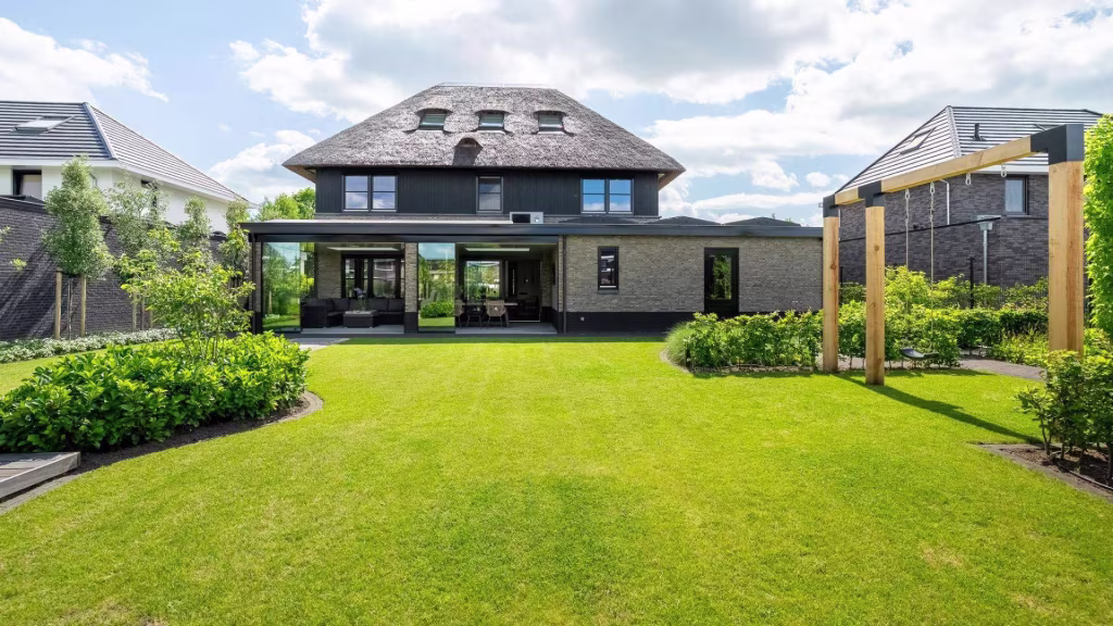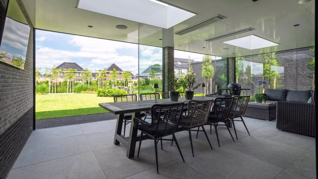 De buitenruimte is minstens zo indrukwekkend als het interieur. De onder architectuur aangelegde tuin biedt een perfect samenspel van groen, privacy en rust. Het overdekte terras met glazen wanden en lichtraten maakt het mogelijk om elk seizoen te genieten van het buitenleven – beschut tegen wind en regen, maar altijd in verbinding met de tuin.