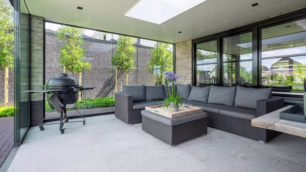 Het overdekte terras is bereikbaar via zowel de woonkamer als de keuken, en is volledig afsluitbaar met een glazen pui. Dankzij de lichtkoepels is dit een fijne plek om het hele jaar door buiten te zitten.