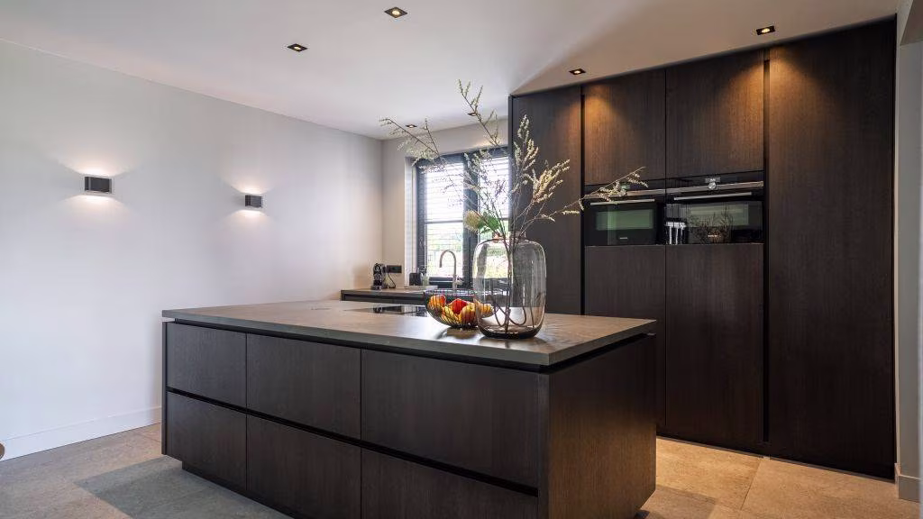 De leefkeuken is ingericht met een kookeiland en een kastenwand, beide voorzien van hoogwaardige inbouwapparatuur. Aansluitend vindt u via dubbele deuren de woonkamer, met veel lichtinval en toegang tot het overdekte terras via een schuifpui.