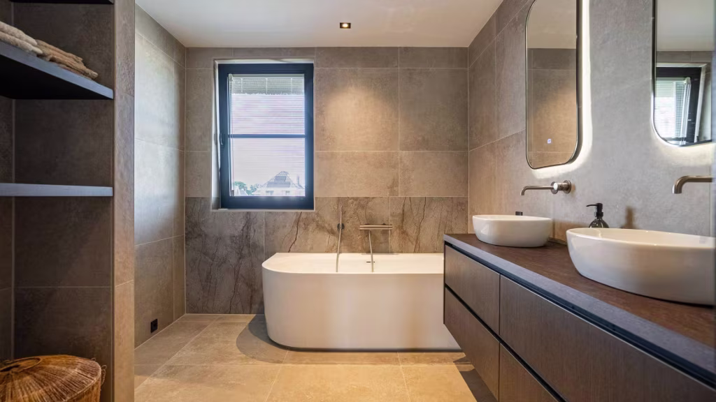 Overloop met toegang tot drie ruime slaapkamers, waarvan één is voorzien van een inloopkast. De badkamer is compleet uitgerust met een dubbele wastafel, ligbad en een inloopdouche. Op de overloop bevindt zich een apart toilet. De overloop beschikt daarnaast over een Frans balkon, wat zorgt voor extra licht en een open gevoel.