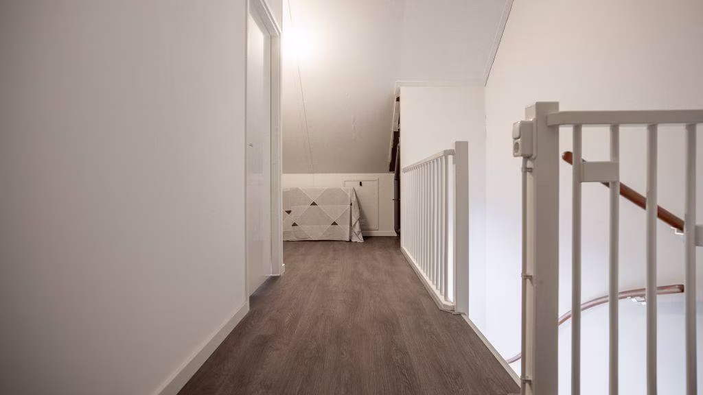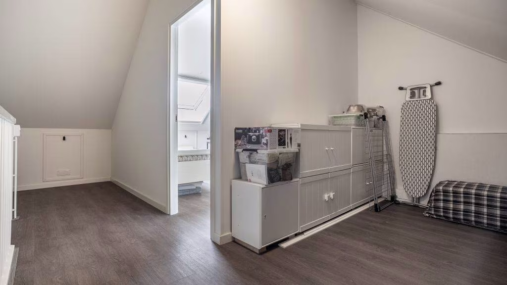 Middels vaste trap naar voorzolder met opstelplaats witgoed apparatuur en cv-ketel, deur naar vierde slaapkamer met dakraam, voldoende bergruimte achter de schuine kanten.