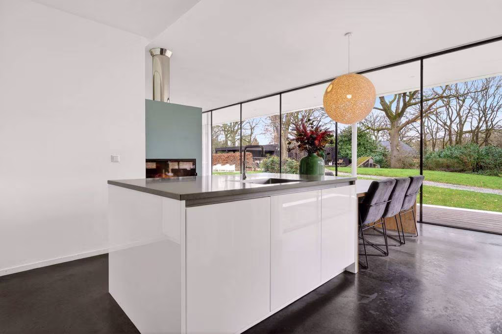Bij binnenkomst wordt direct duidelijk dat deze woning met oog voor detail en kwaliteit is gerealiseerd. De open en lichte leefruimtes creëren een ruimtelijk gevoel. Grote glaspartijen zorgen voor een overvloed aan daglicht en bieden tegelijkertijd een panoramisch zicht op het omliggende landschap.