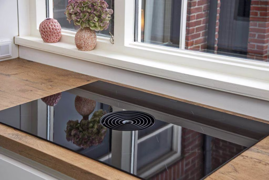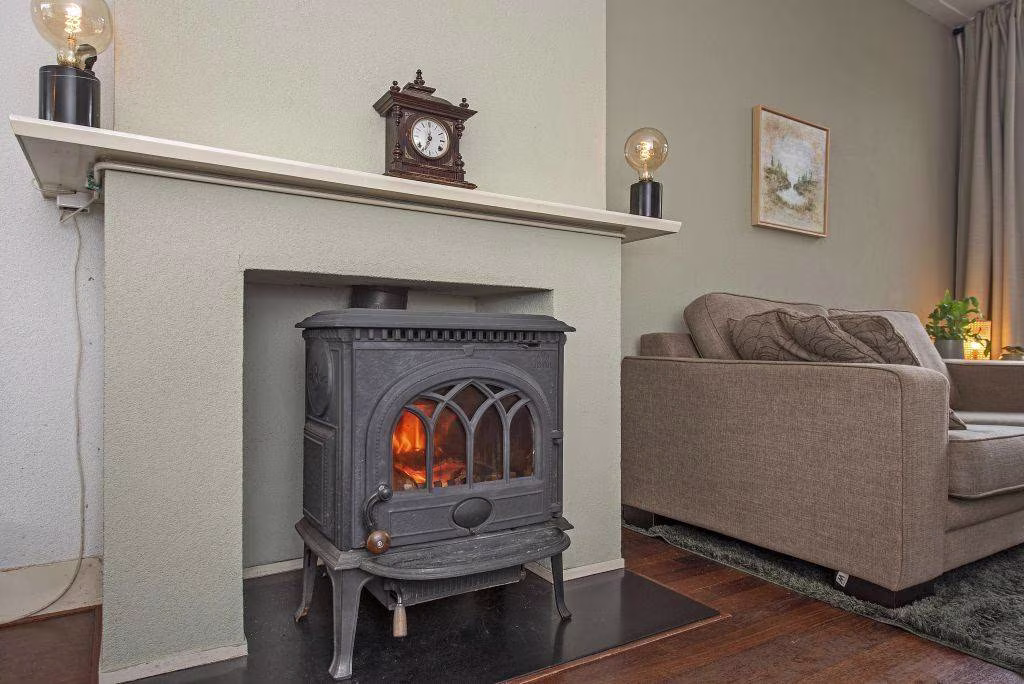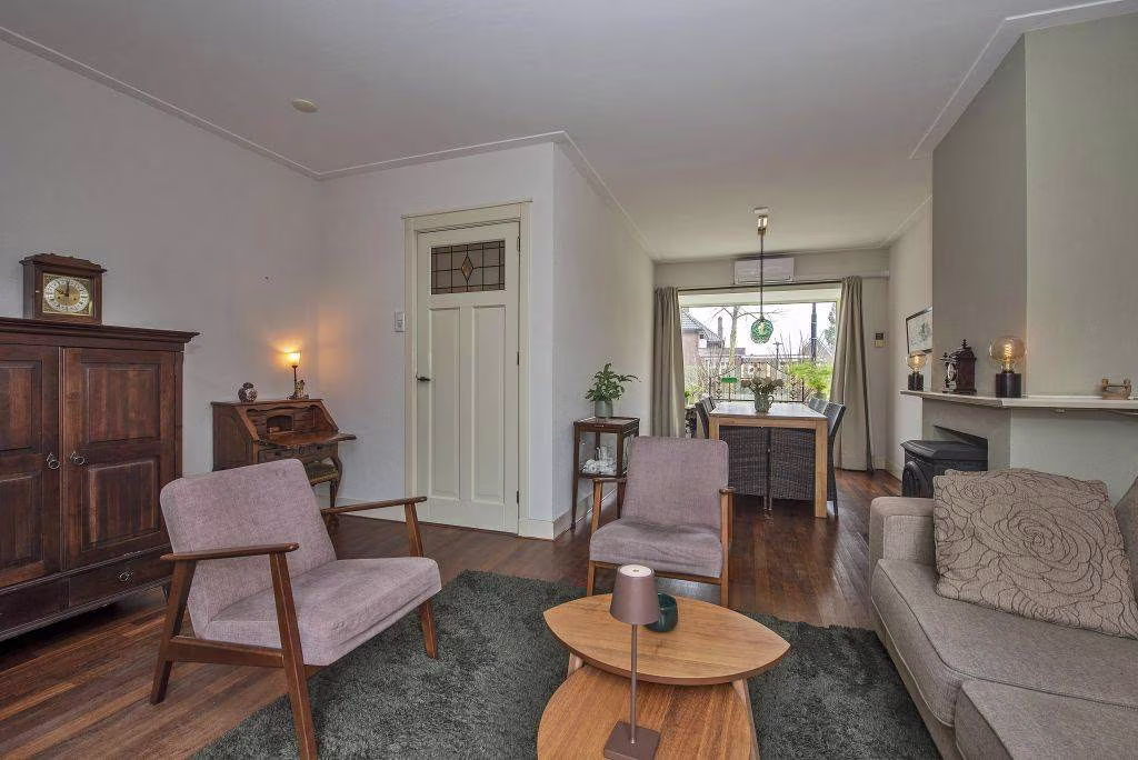 De woonkamer ademt sfeer. De erker zorgt voor extra lichtinval en geeft het geheel een warme uitstraling. De houten begane grondvloer en de houtkachel dragen bij aan het karakter van het huis. Aan de achterzijde openen de openslaande deuren naar de tuin, waardoor binnen en buiten moeiteloos in elkaar overlopen.