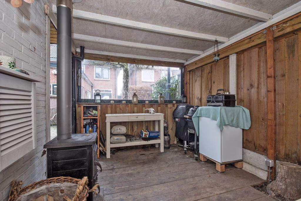 Achterin de tuin staat een vrijstaande berging met overkapping. Ideaal voor het stallen van fietsen, het opbergen van tuingereedschap of het creëren van een knusse loungeplek onder de overkapping.