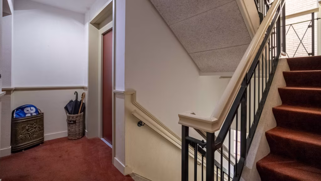 Entree via video-installatie, trap en lift opgang naar parkeerkelder, bergingen en woningen.