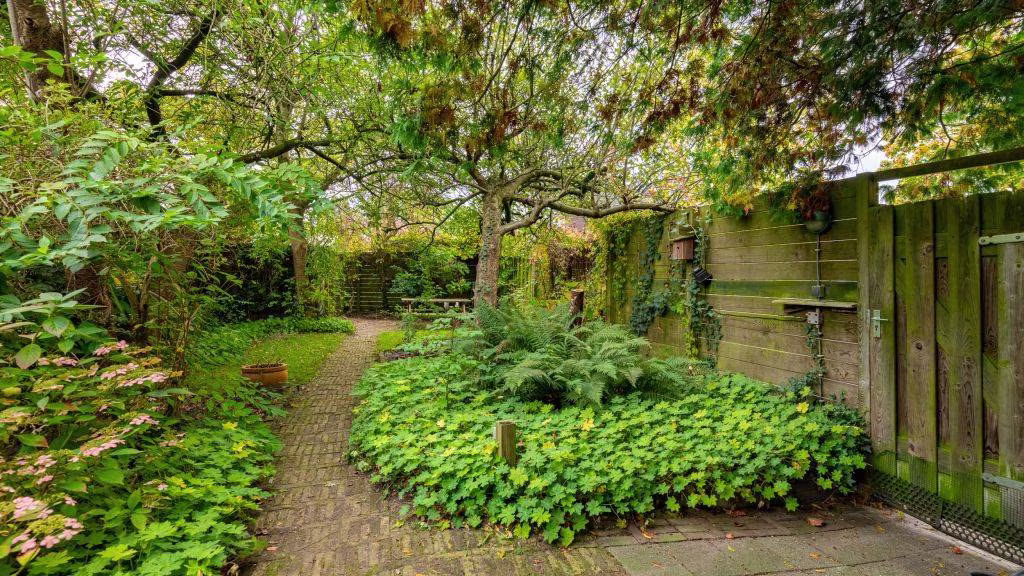 De praktische keuken is zowel vanuit de hal als eetkamer te bereiken. Het toilet en de bijkeuken, voorzien van witgoed-aansluiting, bevinden zich achter de keuken. De heerlijk diepe achtertuin, bereikbaar vanuit de berging en eetkamer, ligt op het zuiden.