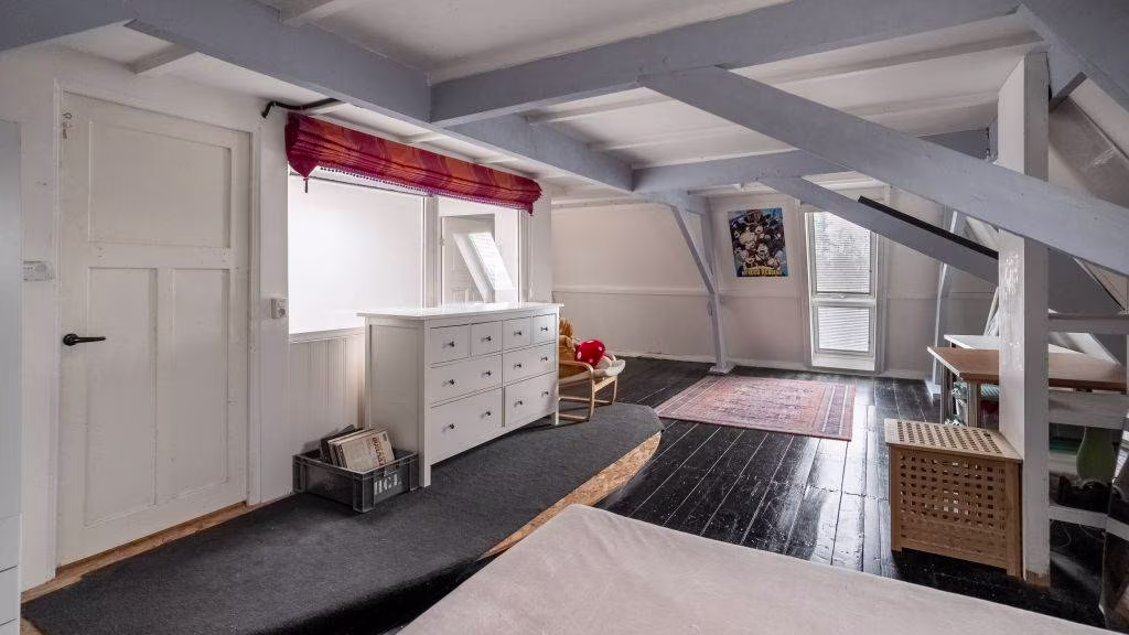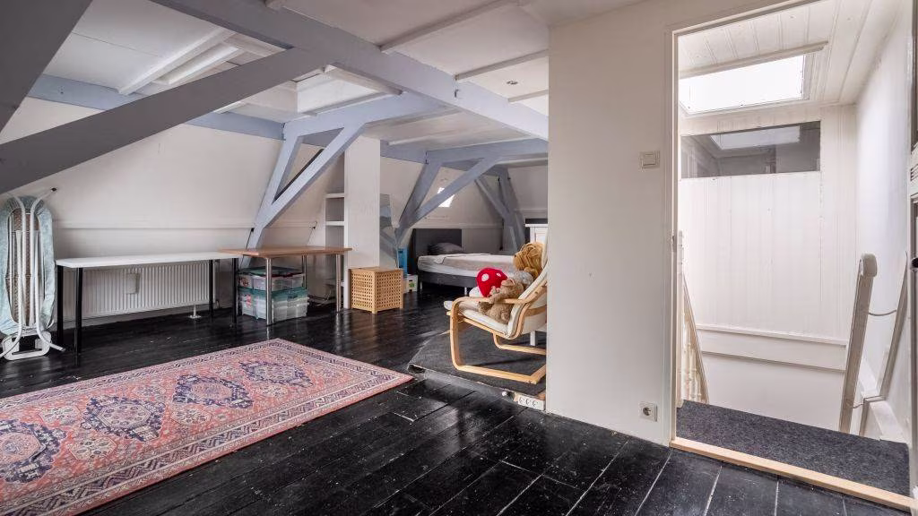 Vaste trap naar de zolderverdieping met een groot dakraam op het zuiden. Hier bevindt zich een royale vierde slaapkamer en berging met cv-installatie.
