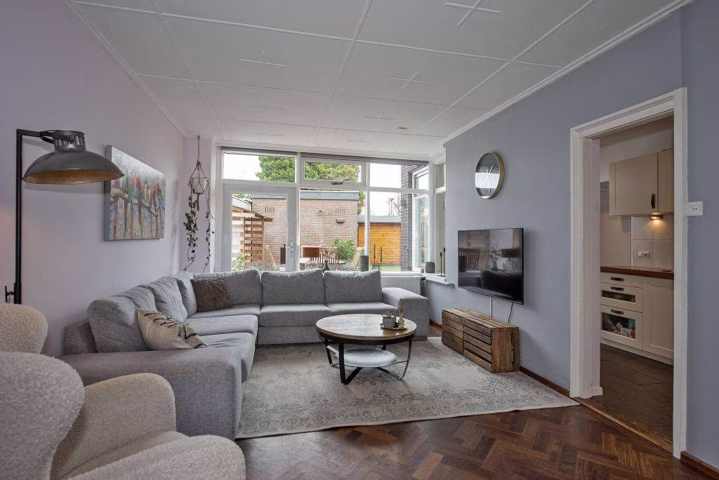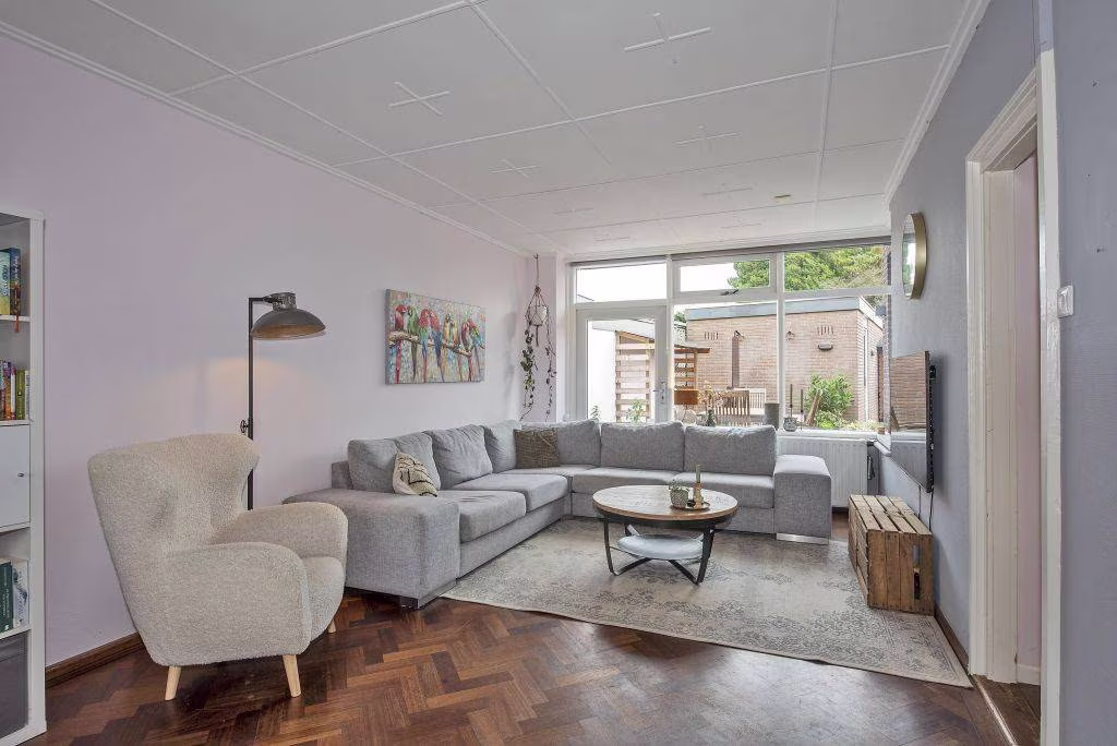 Je komt binnen in een prettige hal waar de trapopgang en de meterkast zich bevinden. De sfeer van de woning laat zich meteen voelen: dit is een huis dat al tientallen jaren bewoond wordt, met een solide basis uit 1951. Vanuit de hal loop je door naar de ruime woonkamer. Het grote raam aan de voorzijde laat veel licht binnen en geeft een mooi uitzicht op het park aan de overkant. Vanuit zowel de woonkamer als de keuken stap je zo de achtertuin in.