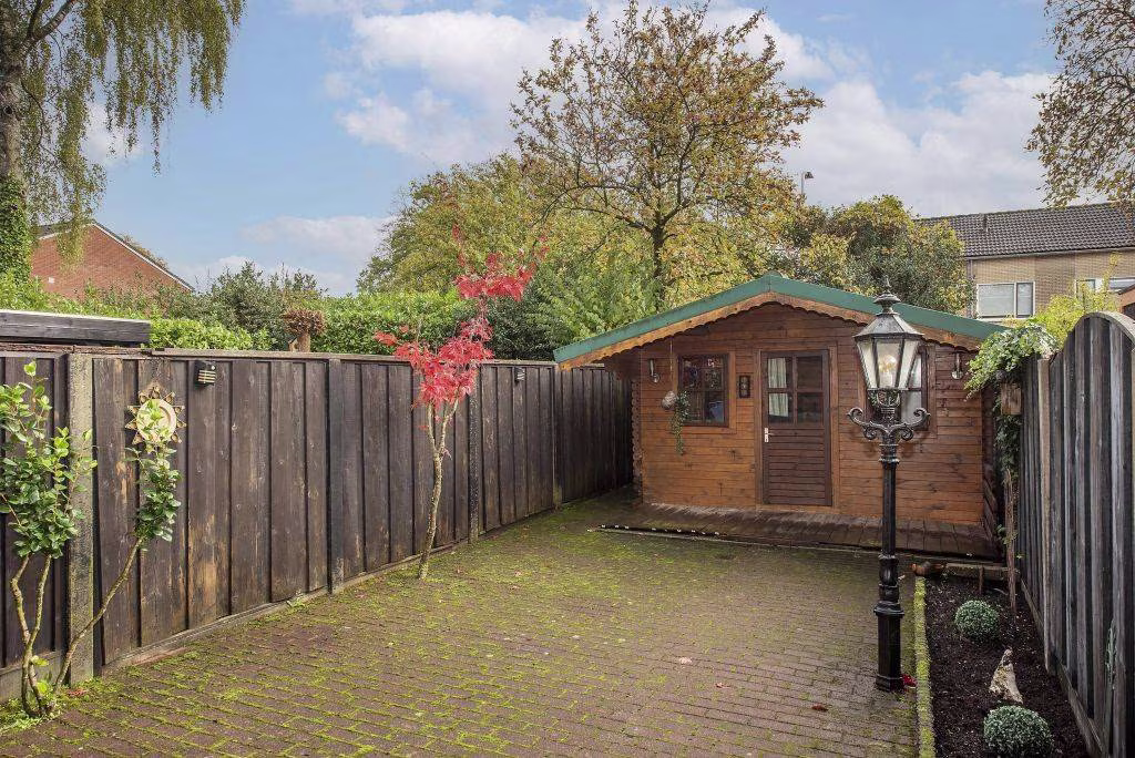 Tuin: achtertuin op het zuidoosten met tuinhuis en achterom. Aan de voorzijde een vrijstaande stenen berging.