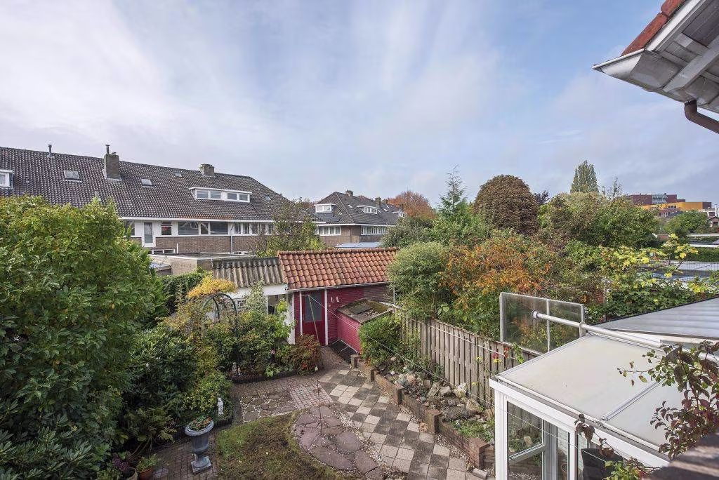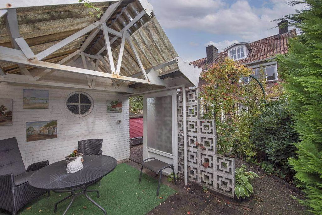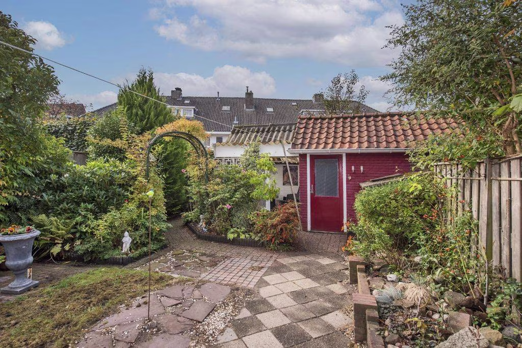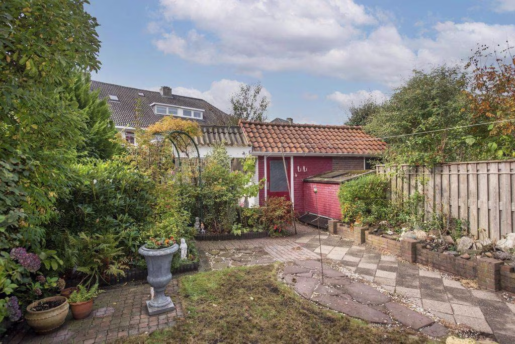 Achter de woning ligt een groene tuin met terras, overkapping en achterom. Dankzij de ligging en beschutting geniet je hier van zon én privacy. De vrijstaande stenen berging biedt ruimte voor de fietsen of het tuingereedschap.