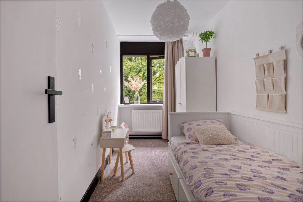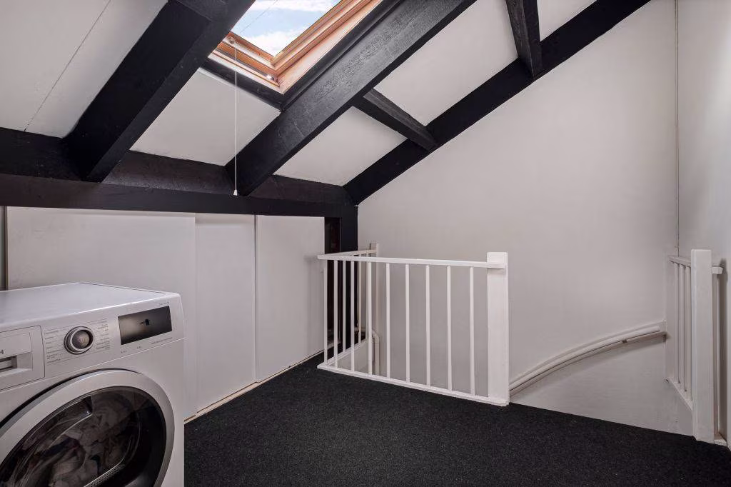De zolder biedt verrassend veel extra ruimte: een aparte wasruimte, volop bergruimte en een grote kamer die uitstekend dienst kan doen als kantoor, speelkamer of vierde slaapkamer.