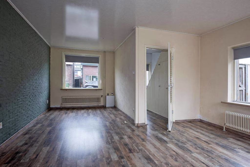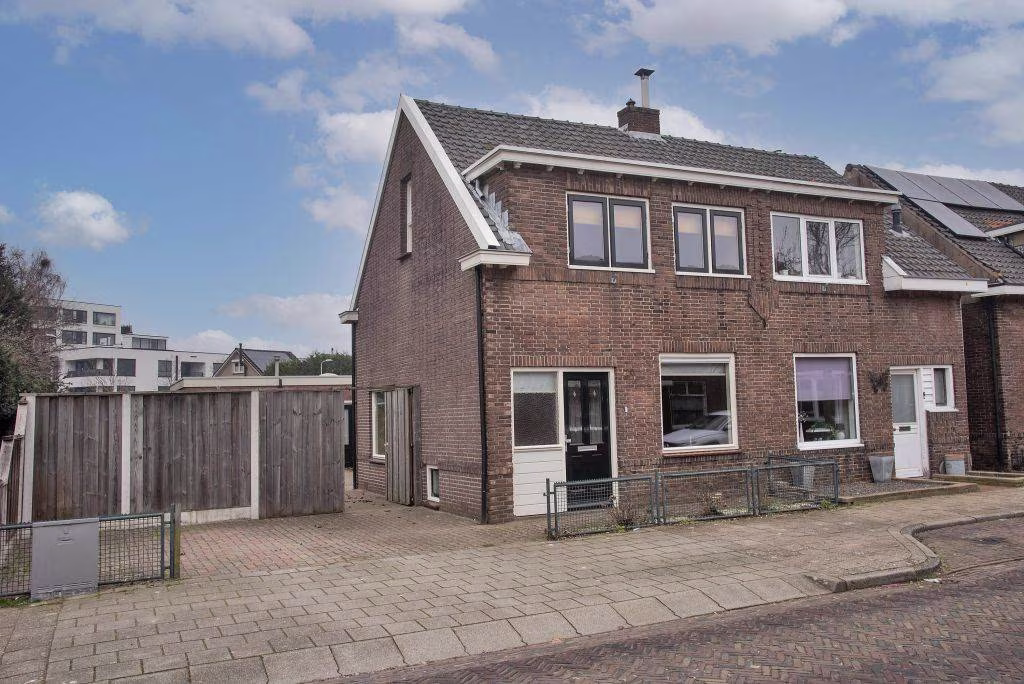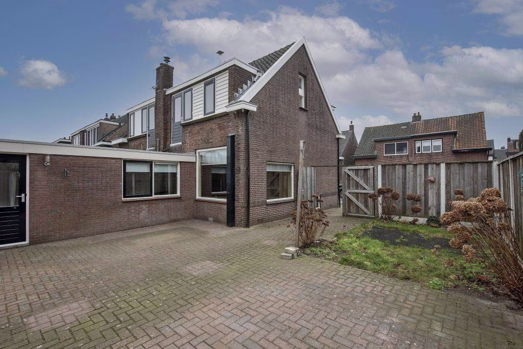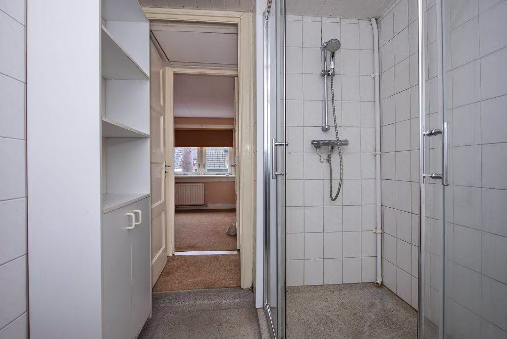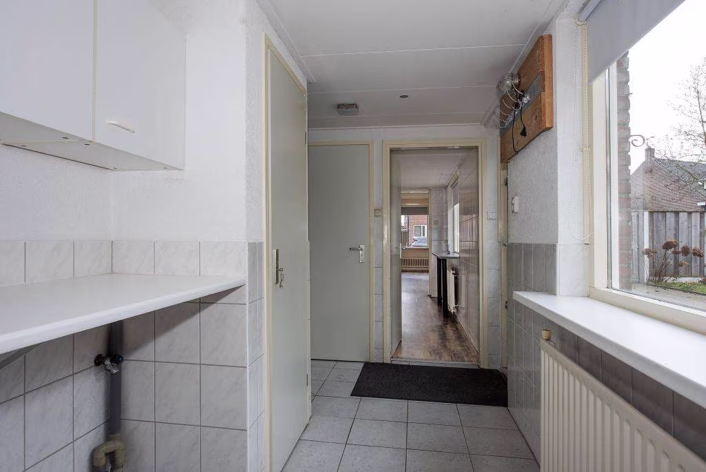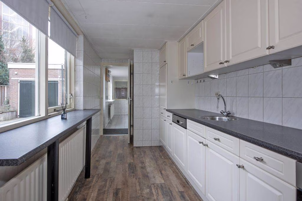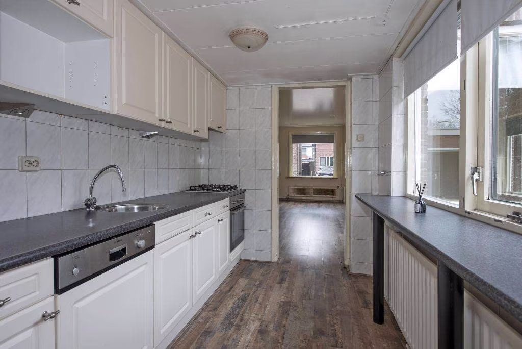 Deze woning uit 1927 is helder ingedeeld en gericht op comfortabel dagelijks gebruik. De woonkamer is overzichtelijk van formaat en vormt samen met de aangebouwde keuken een prettige leefruimte. Grote raampartijen zorgen voor een prettige lichtinval en een open, aangenaam woongevoel. De keuken ligt aan de achterzijde van de woning en is ingericht met een gasfornuis, oven, vaatwasser en koelkast. Aansluitend bevindt zich de bijkeuken, een fijne en praktische ruimte.